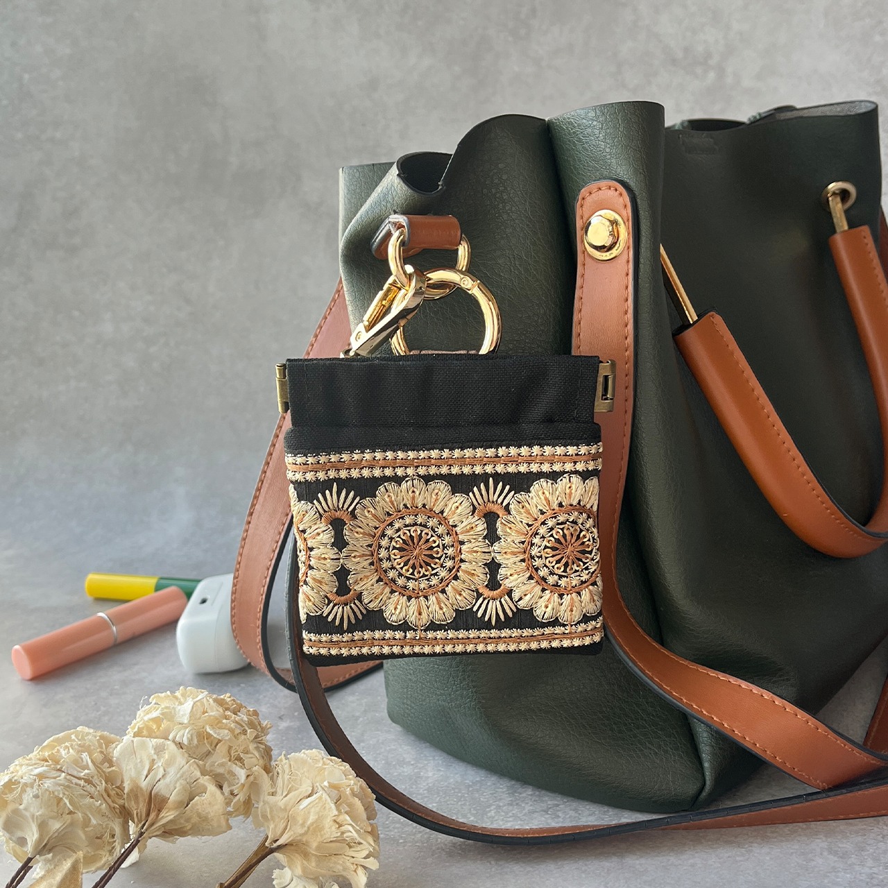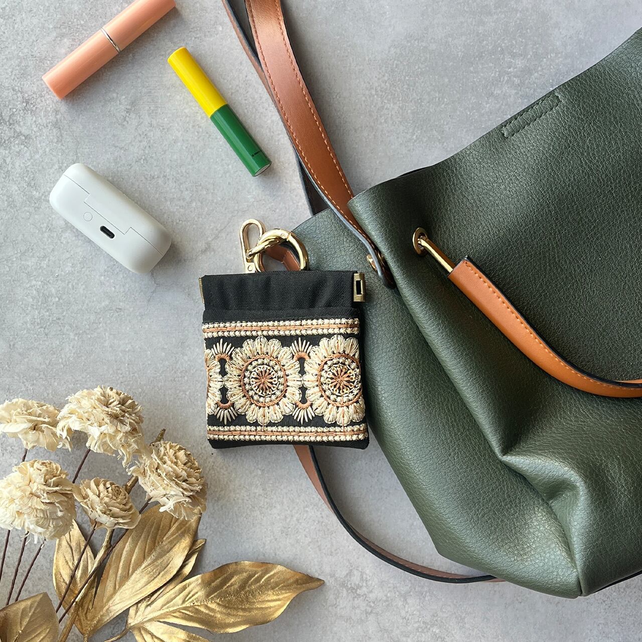 インド刺繍リボンを片面にあしらったカラビナ付きバネ口ミニポーチです。