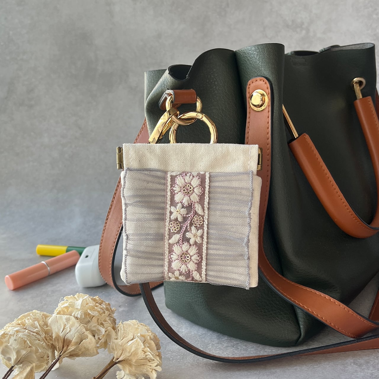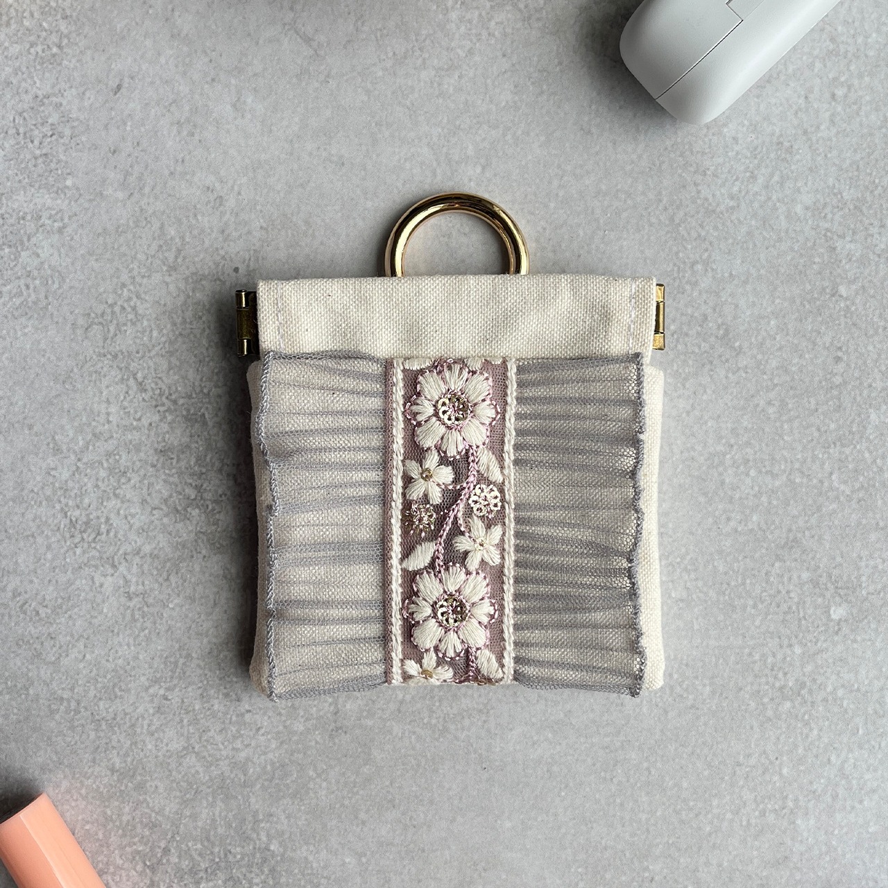 インド刺繍リボンを片面にあしらったカラビナ付きバネ口ミニポーチです。