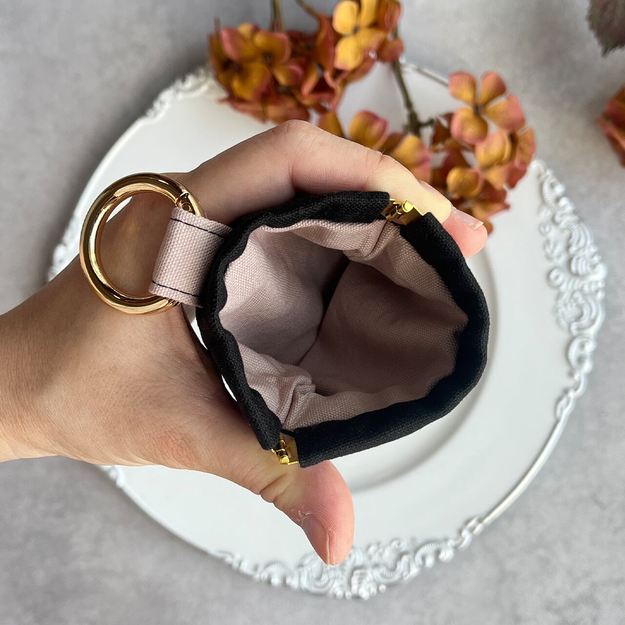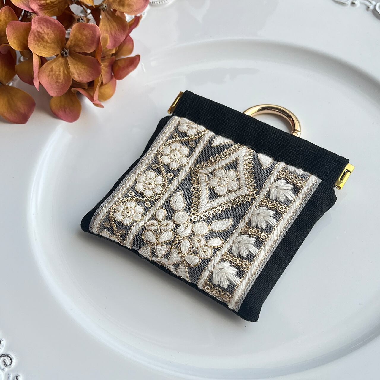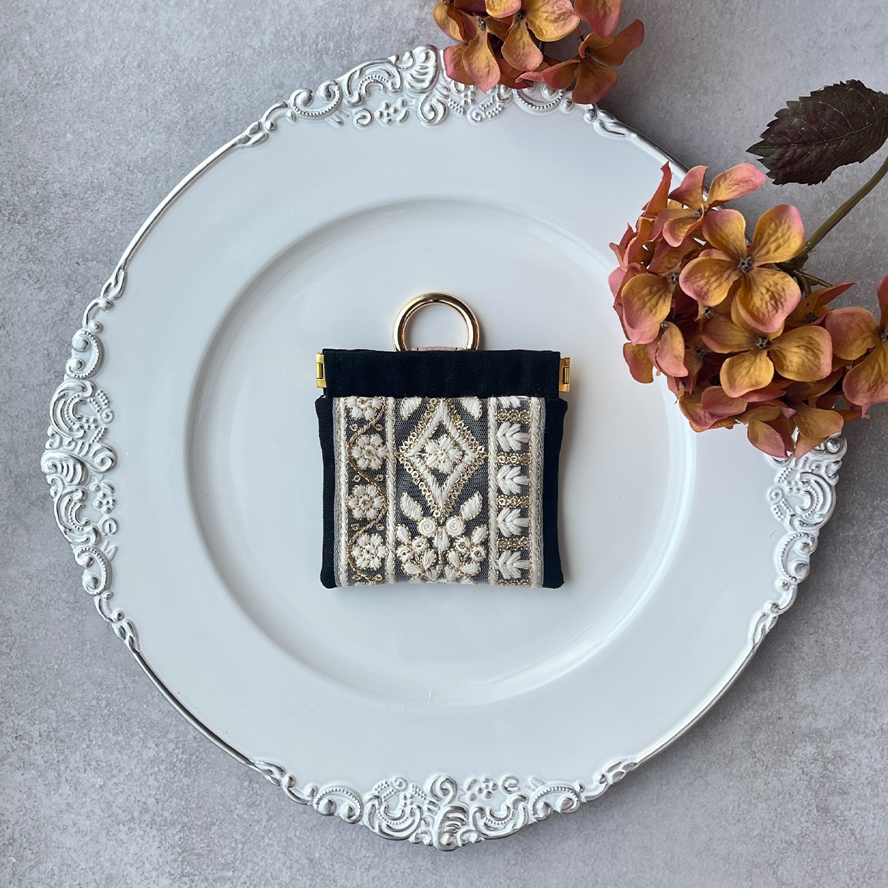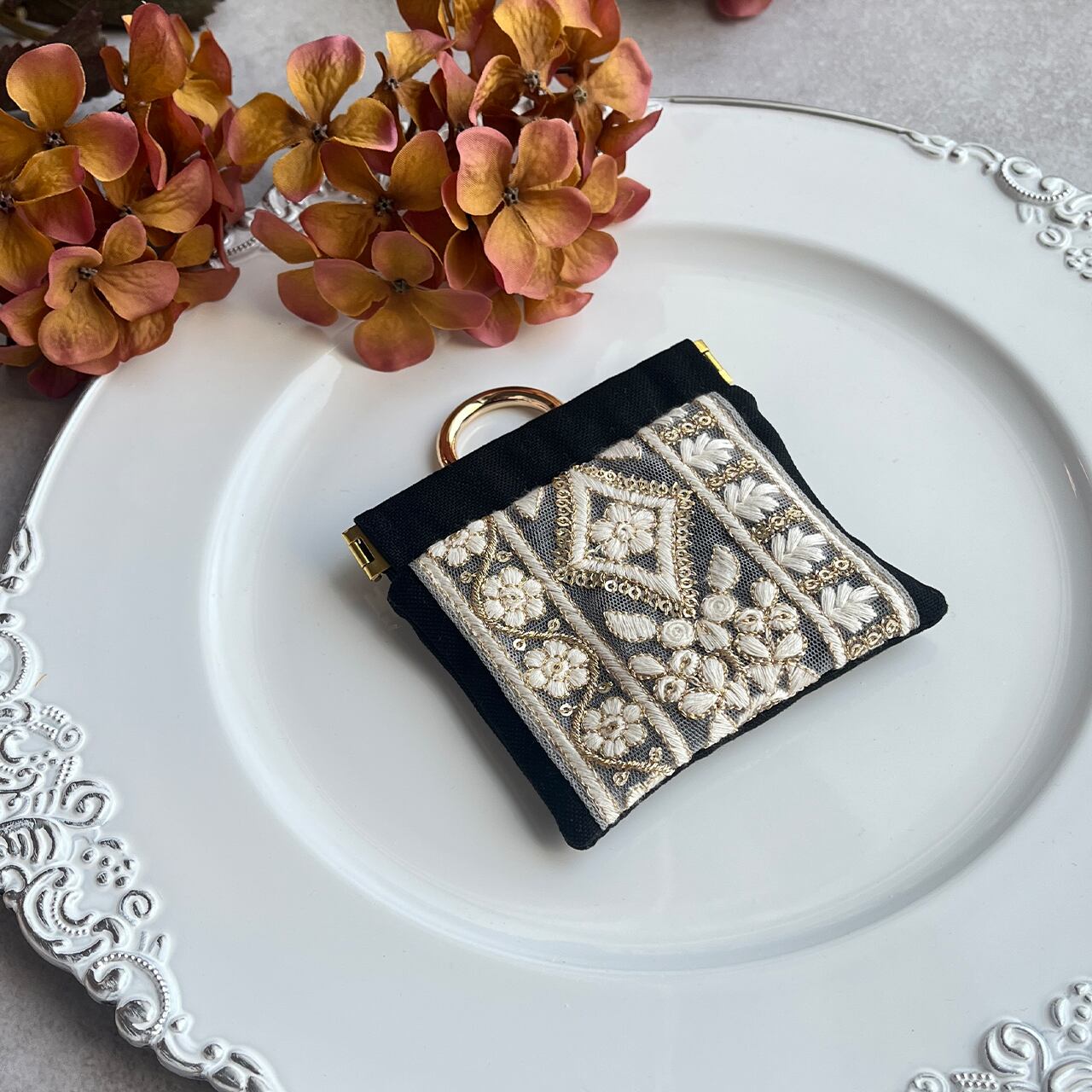 インド刺繍リボンを片面にあしらったカラビナ付きバネ口ミニポーチです。