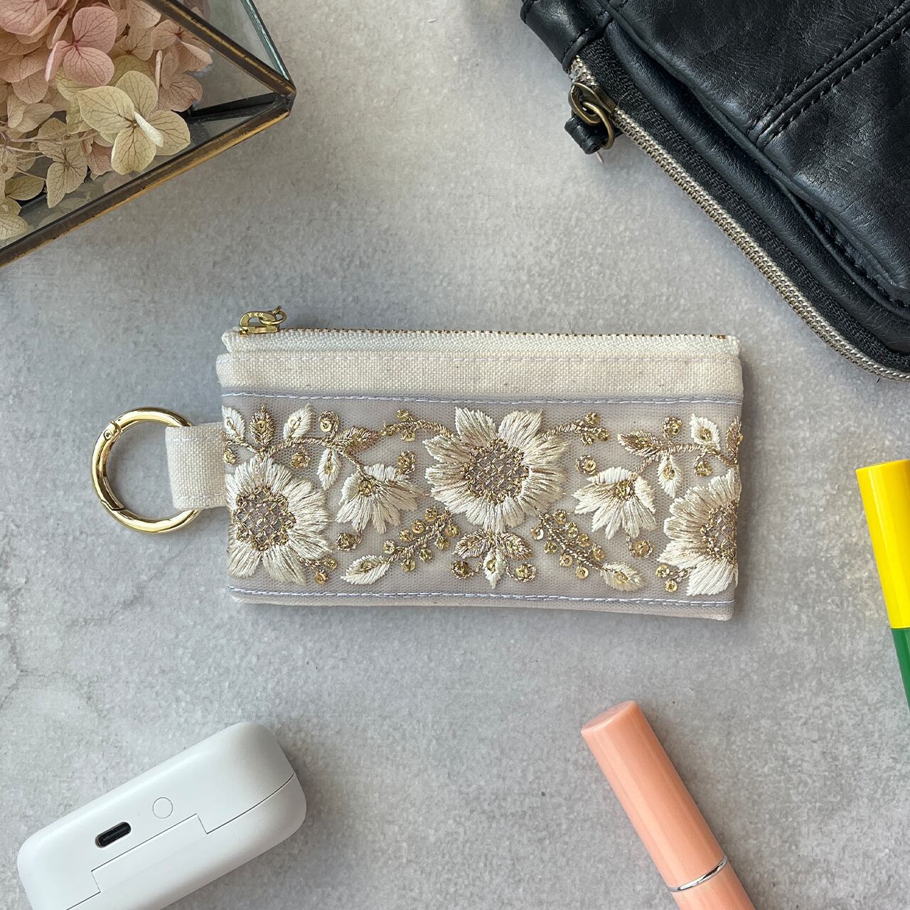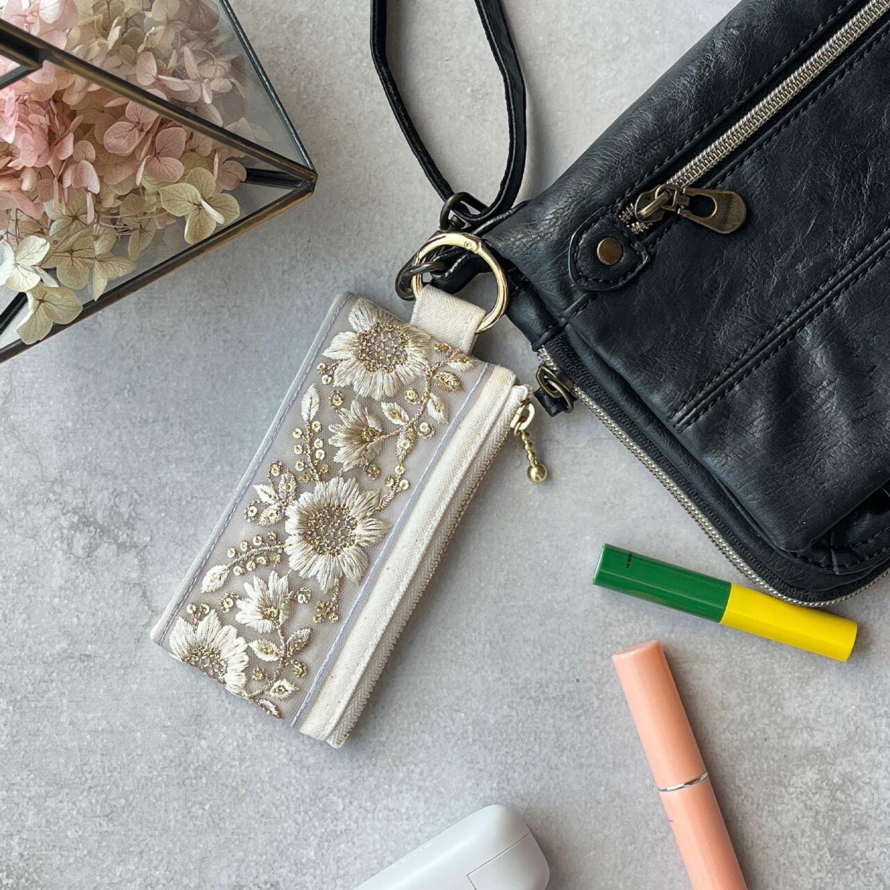 インド刺繍リボンを片面にあしらったミニファスナーポーチです。
