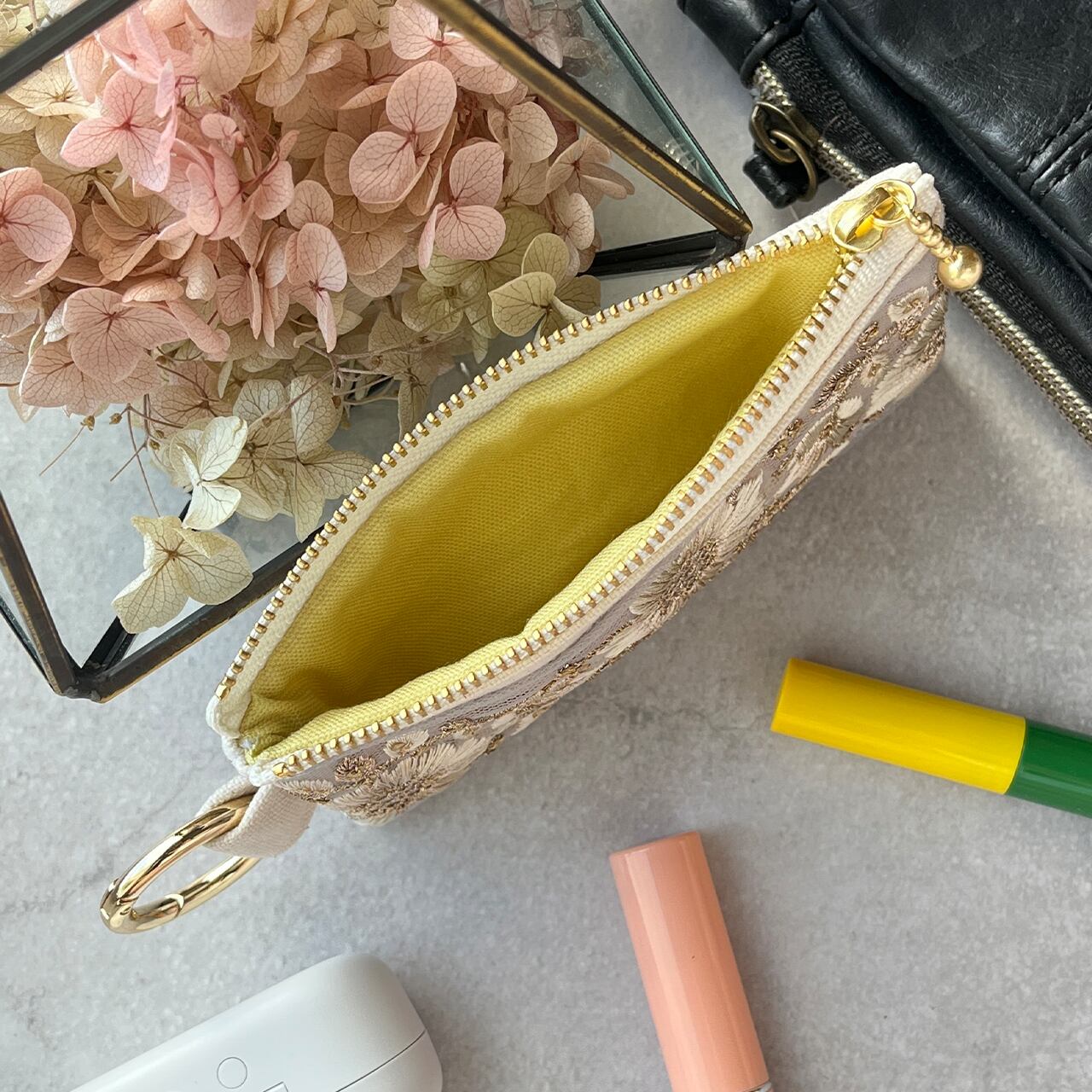 カラビナ付きですので、バッグの中で紛失しがちなリップや常備薬、小銭などの細かなものを持ち歩くのに適しています。