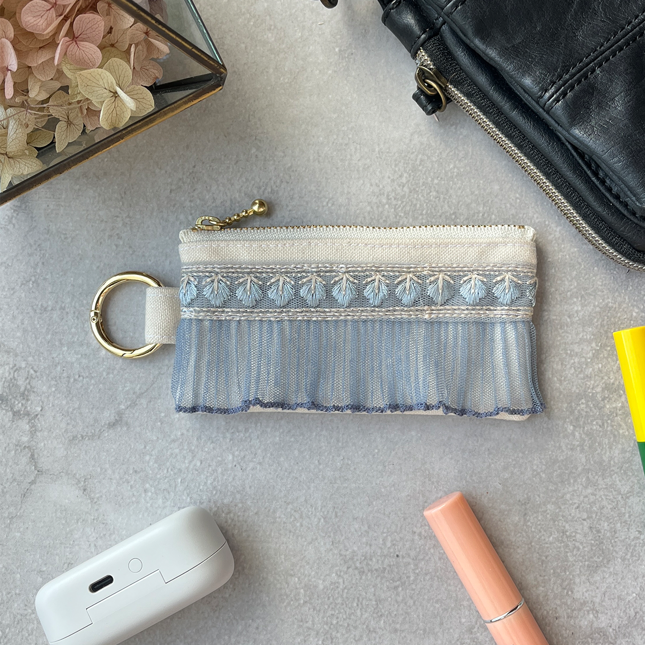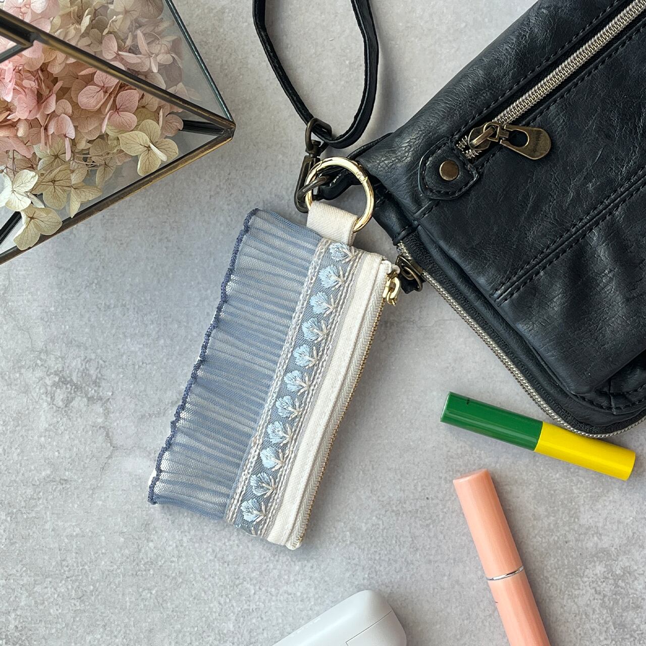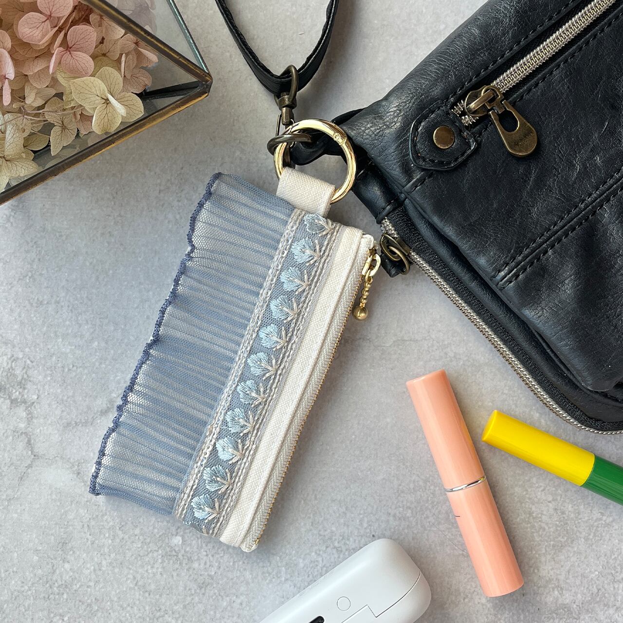 カラビナ付きですので、バッグの中で紛失しがちなリップや常備薬、小銭などの細かなものを持ち歩くのに適しています。
