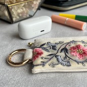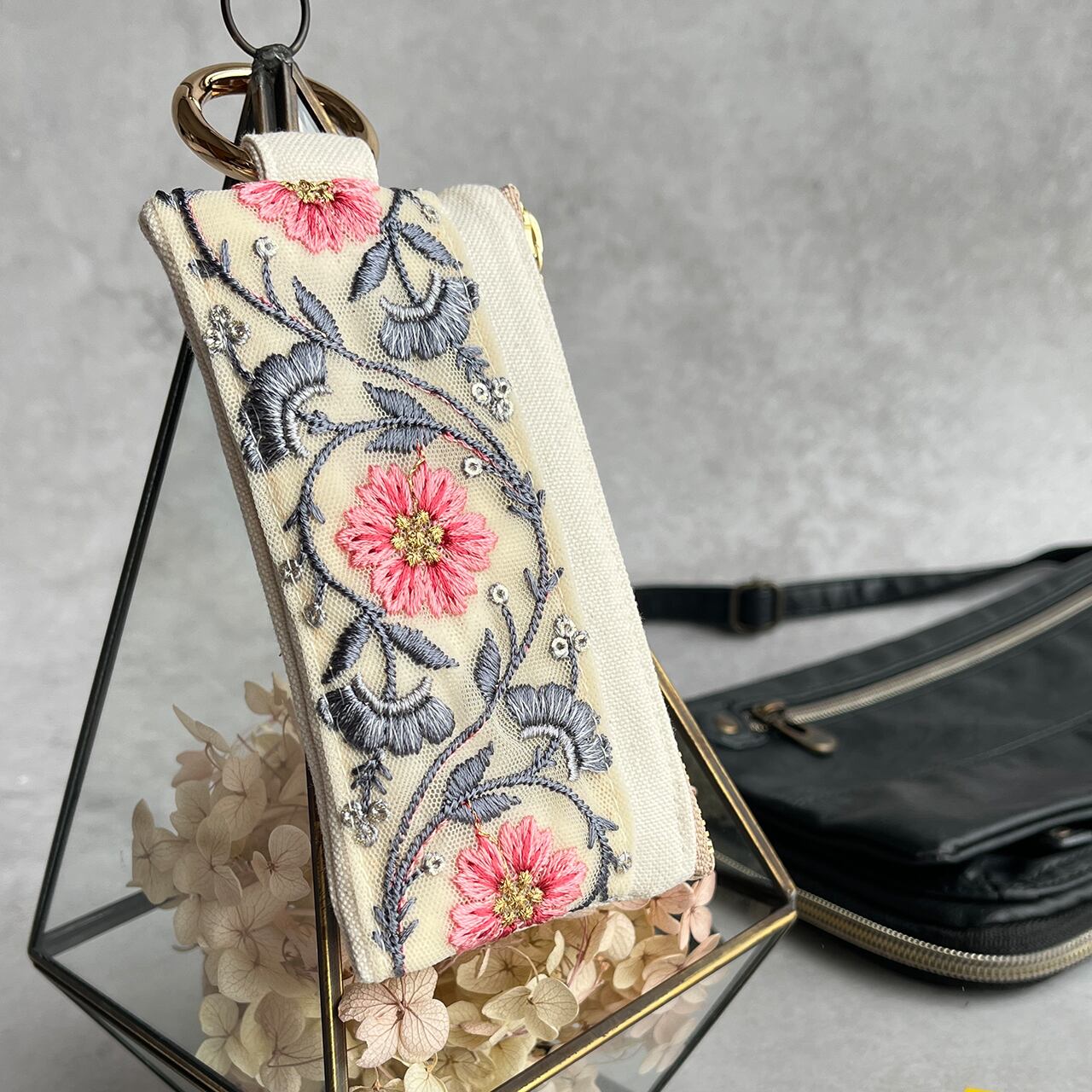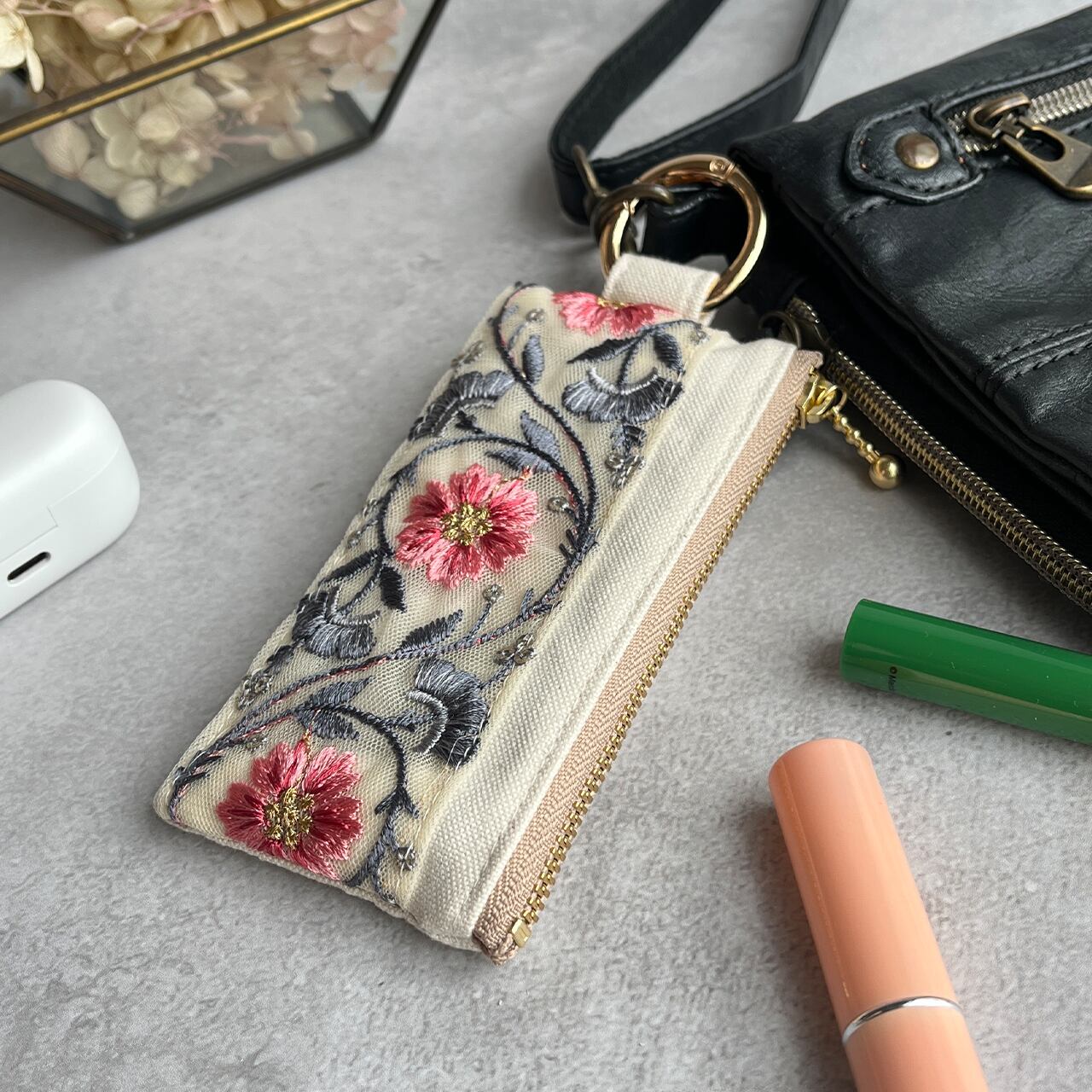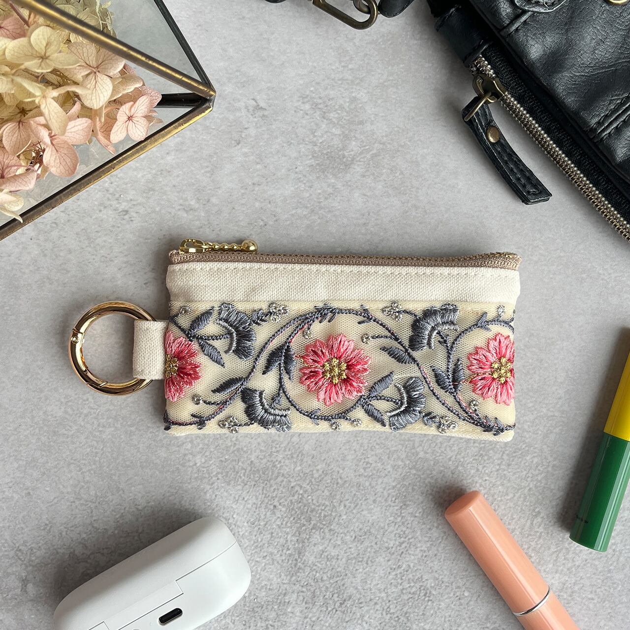 インド刺繍リボンを片面にあしらったミニファスナーポーチです。