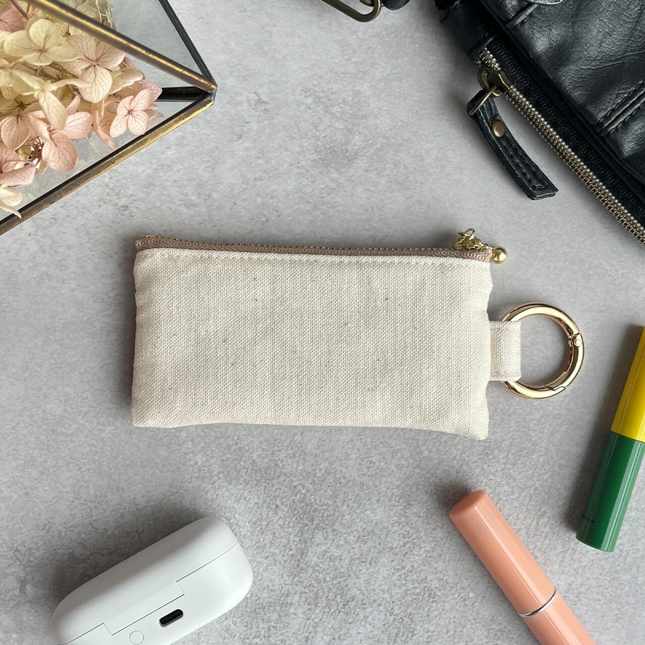 カラビナ付きですので、バッグの中で紛失しがちなリップや常備薬、小銭などの細かなものを持ち歩くのに適しています。