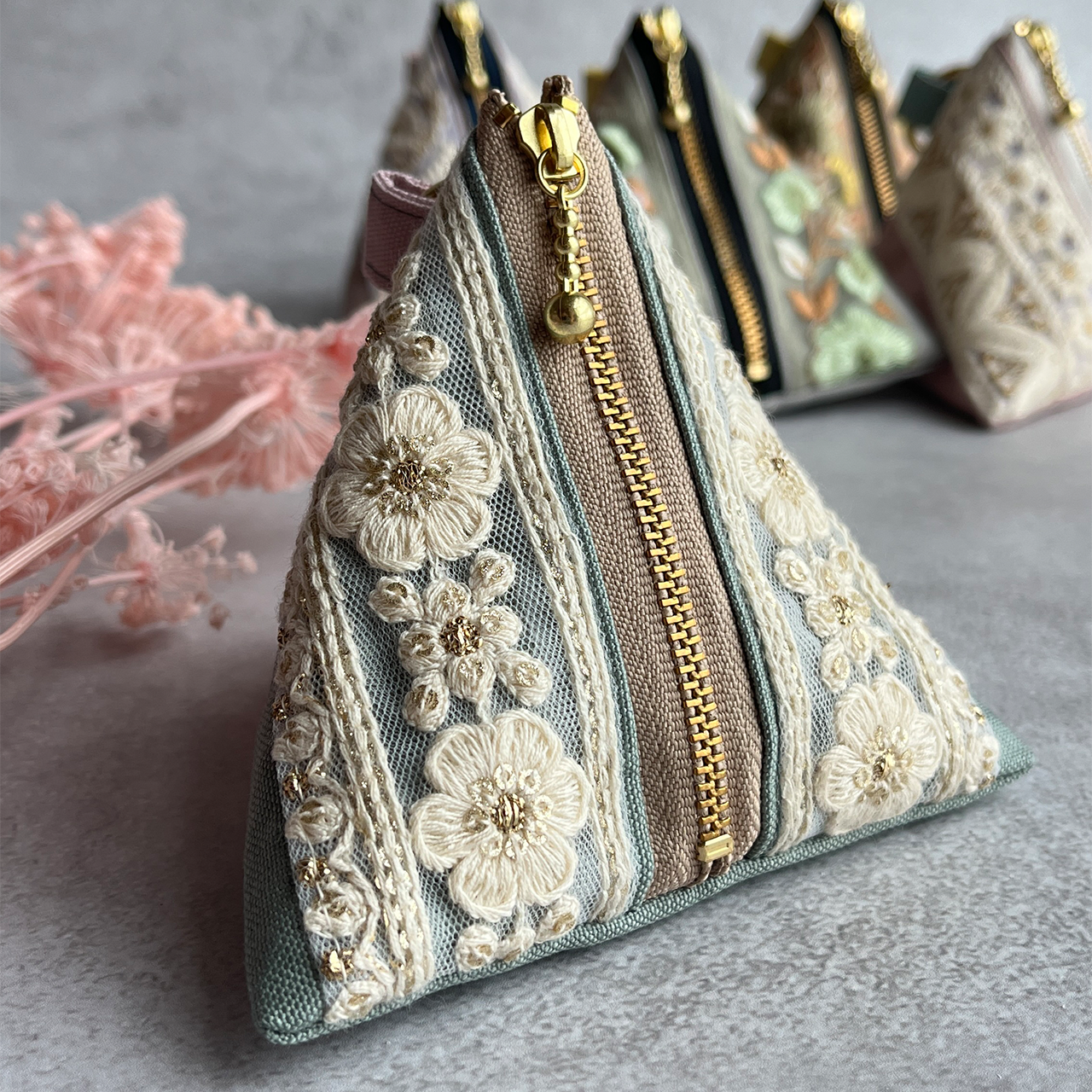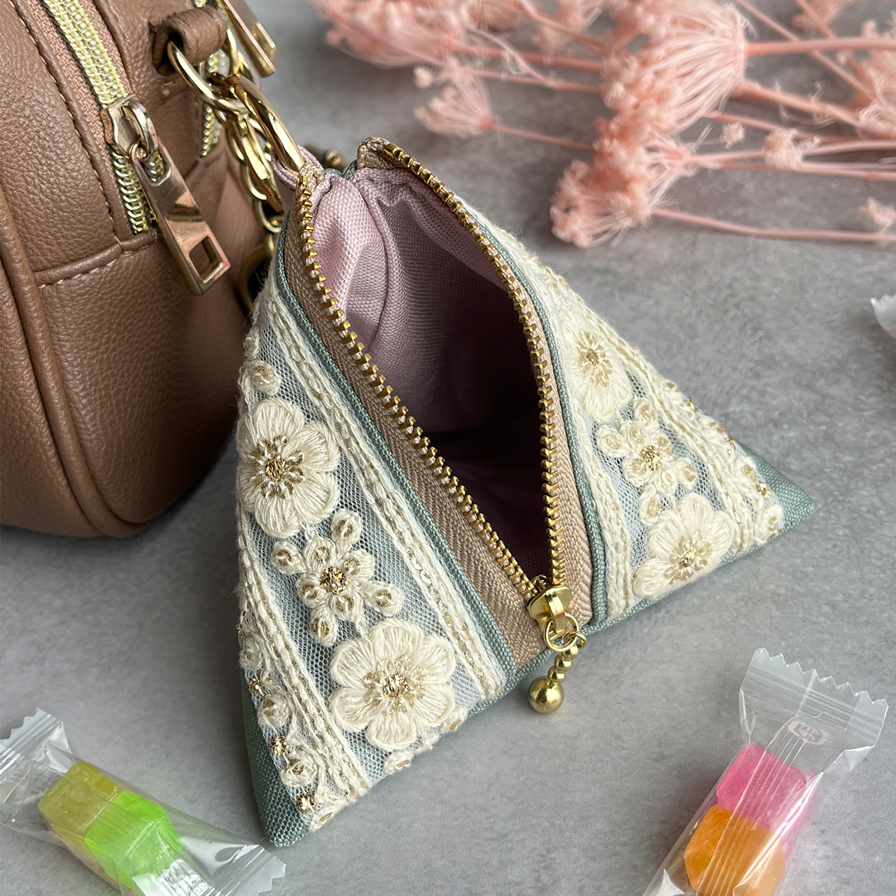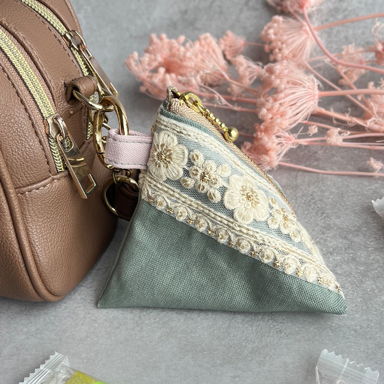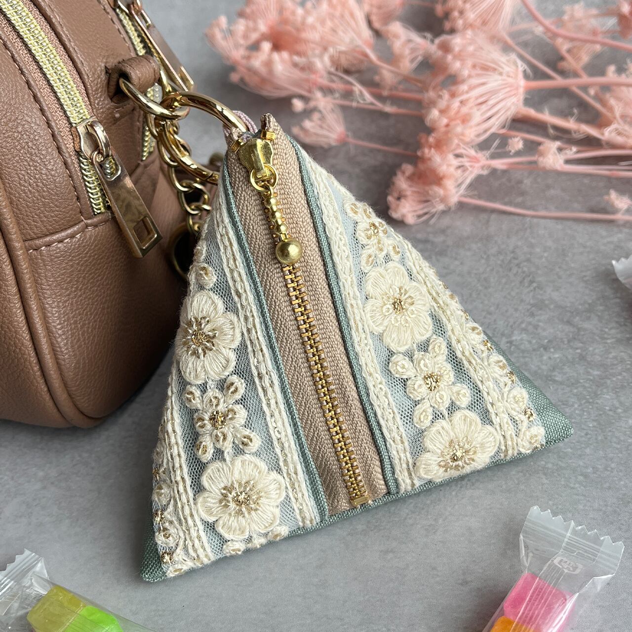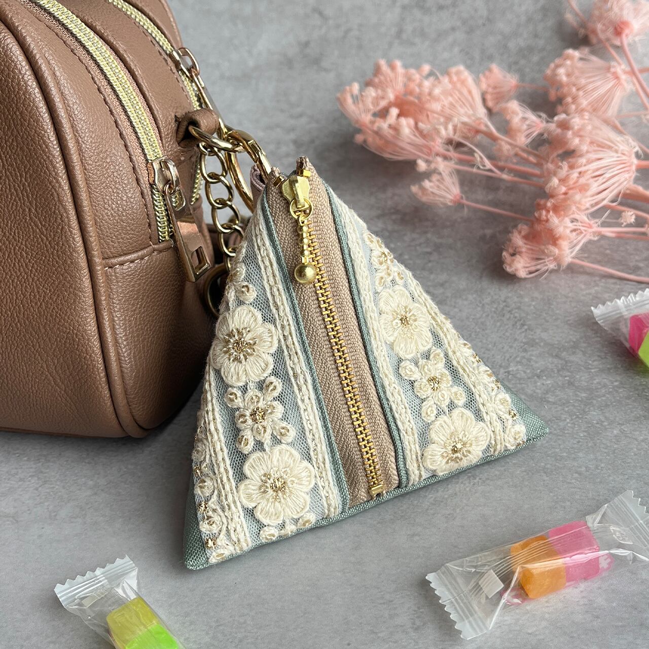 持ち歩きたくなる三角の可愛いフォルムがバックを華やかに。