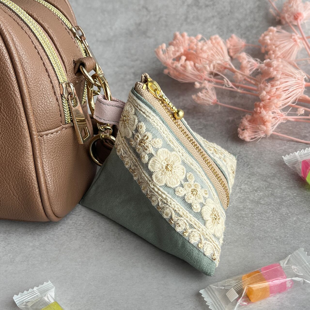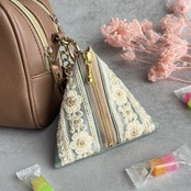 インド刺繍リボンをあしらったテトラポーチです。