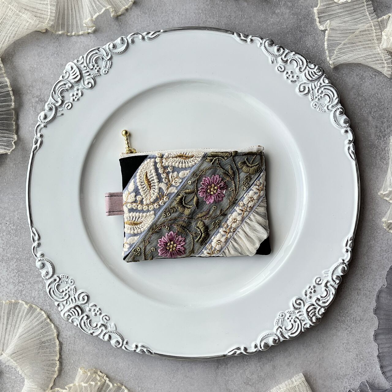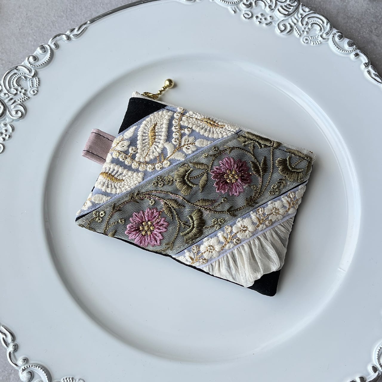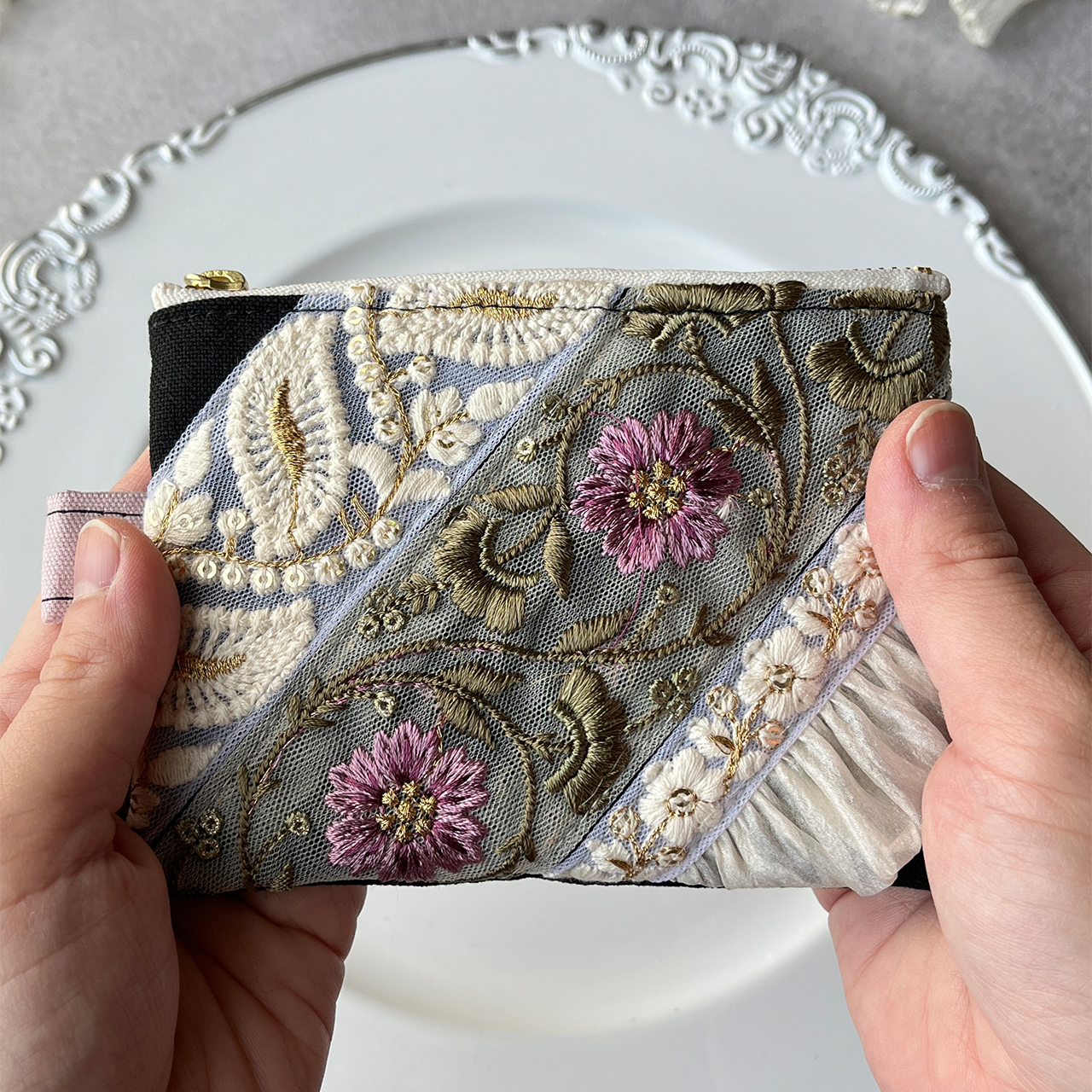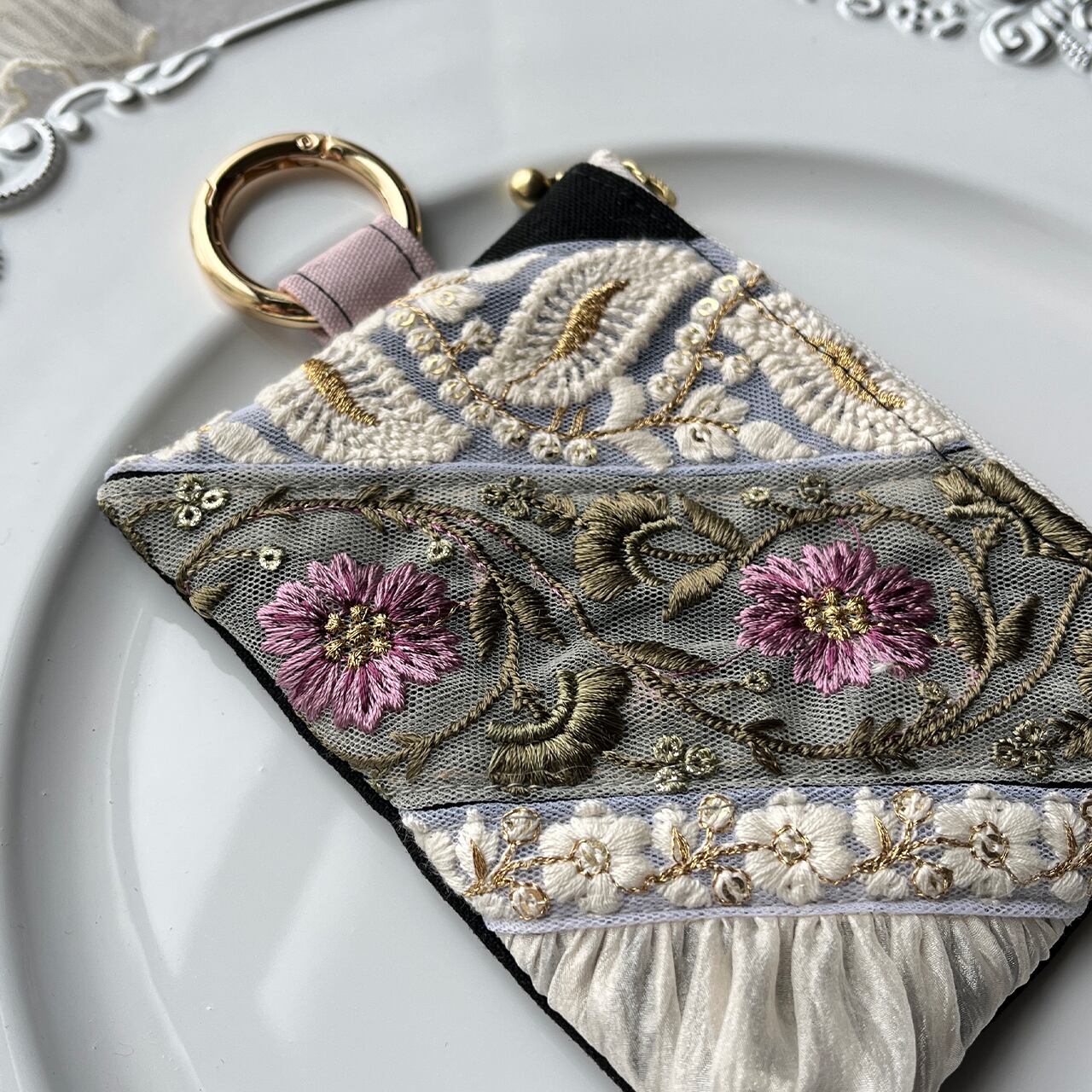 主役になるインド刺繍リボンのフラットポーチ