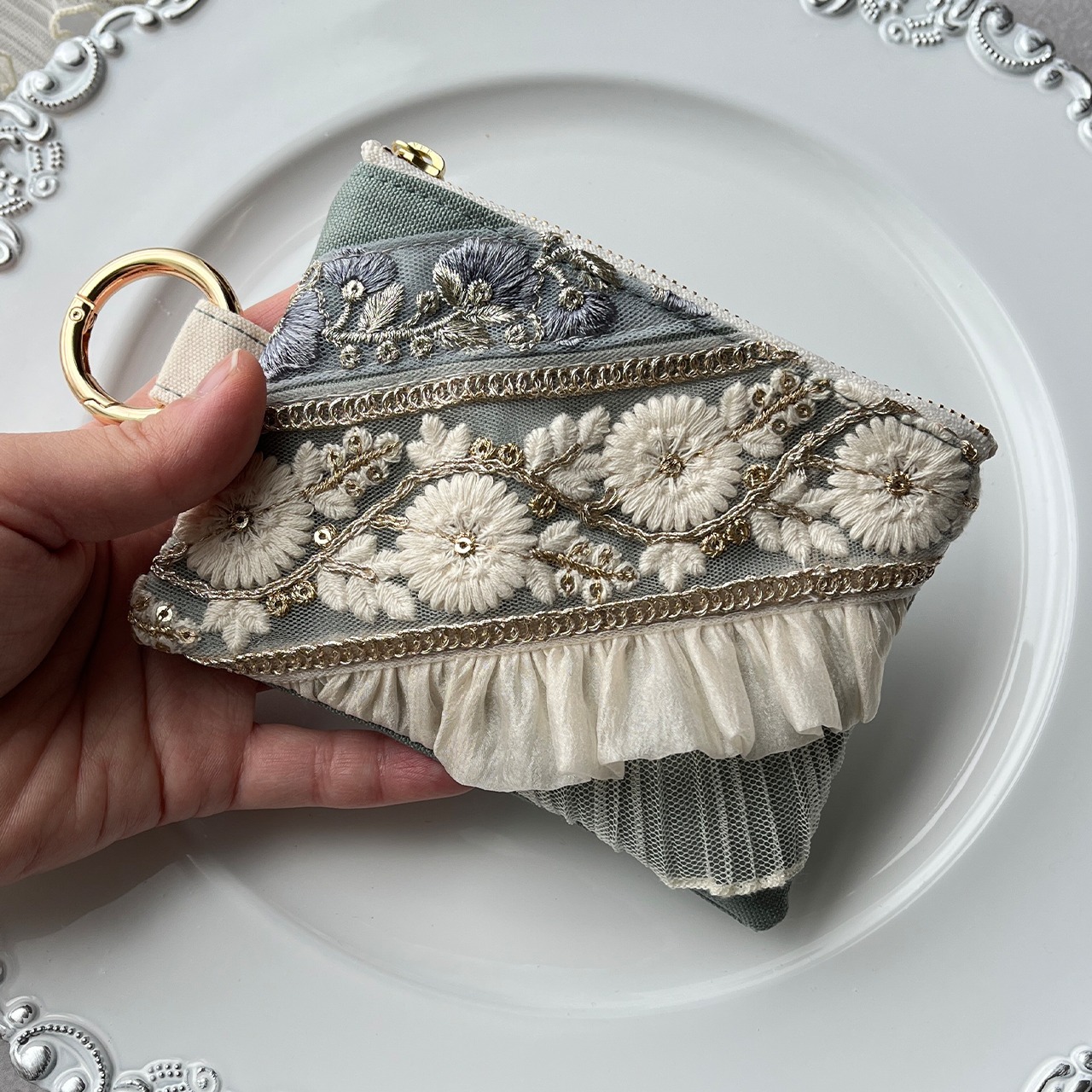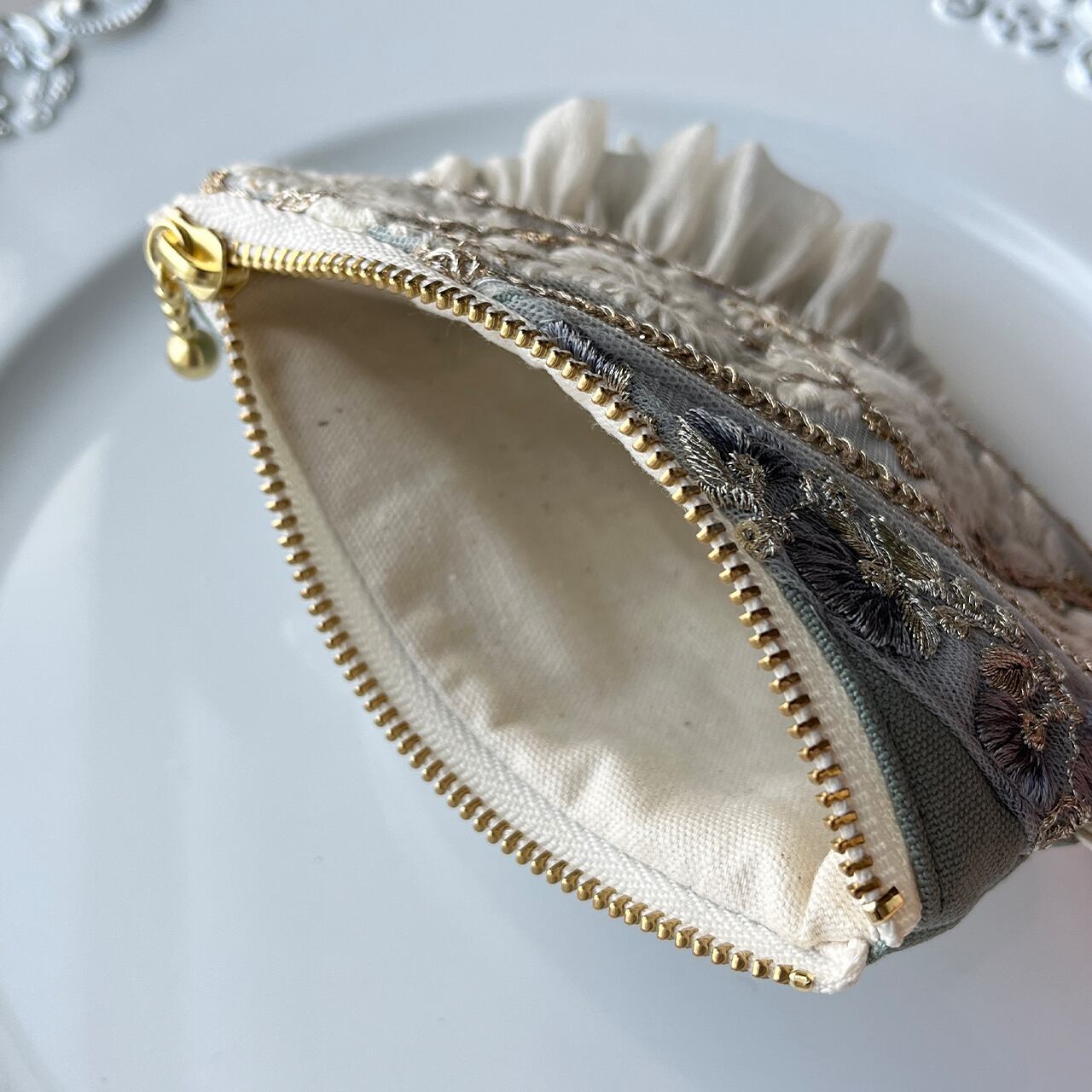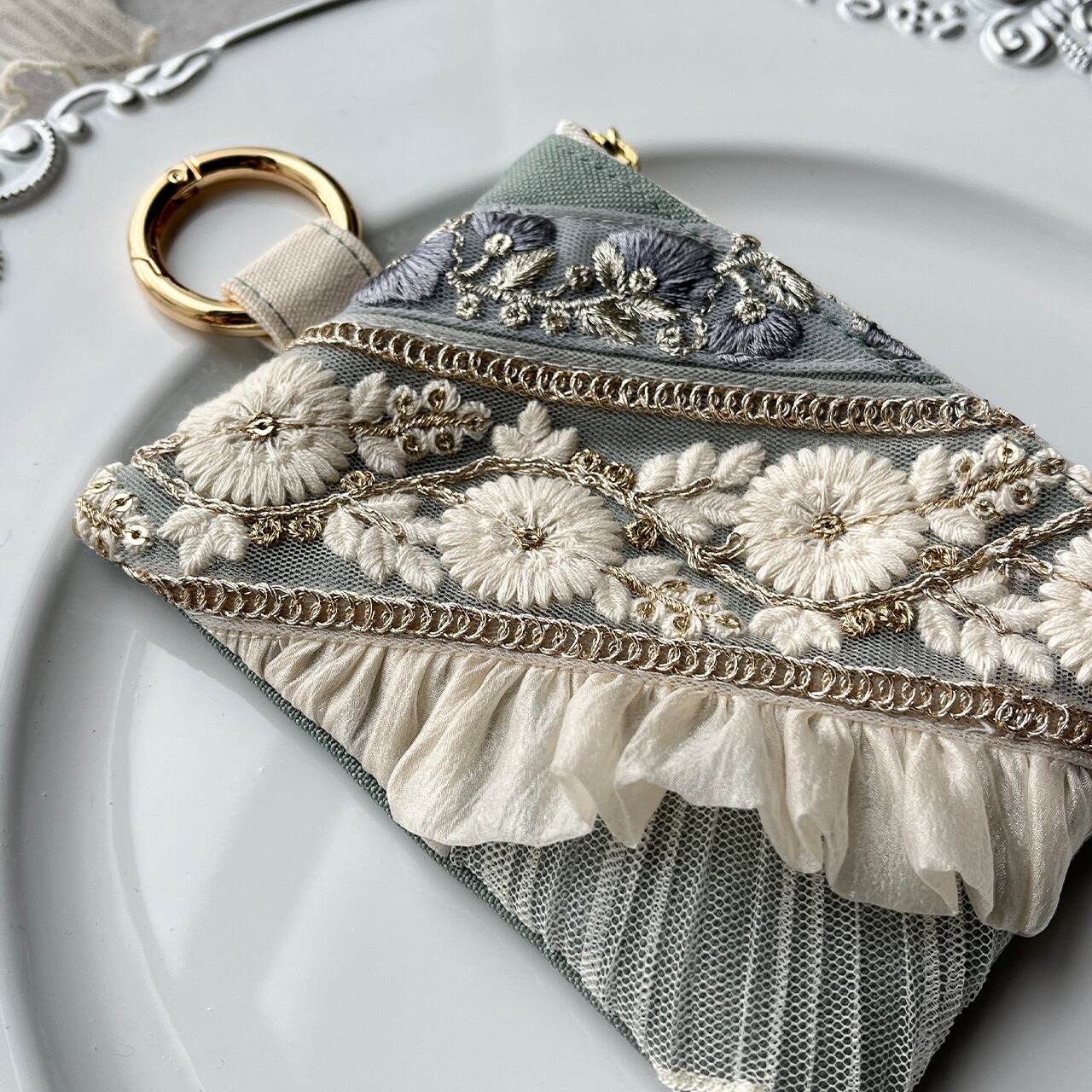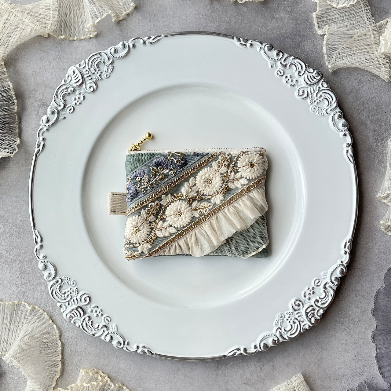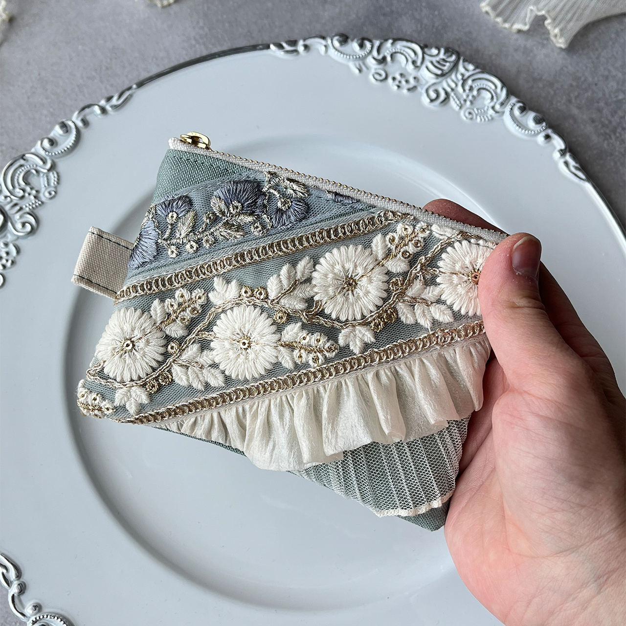 主役になるインド刺繍リボンのフラットポーチ