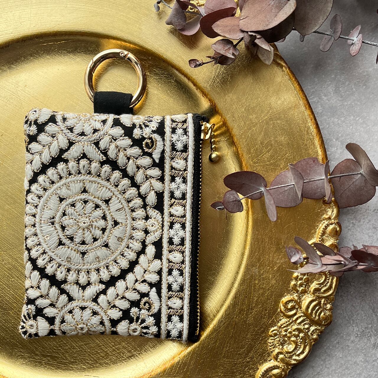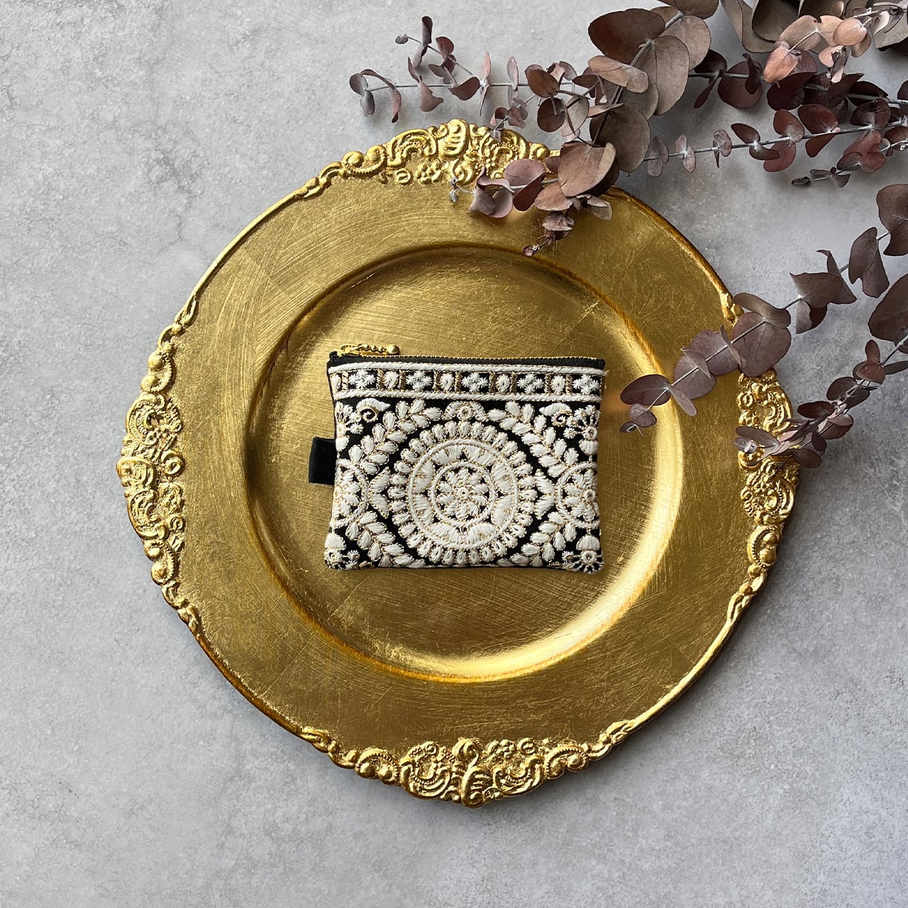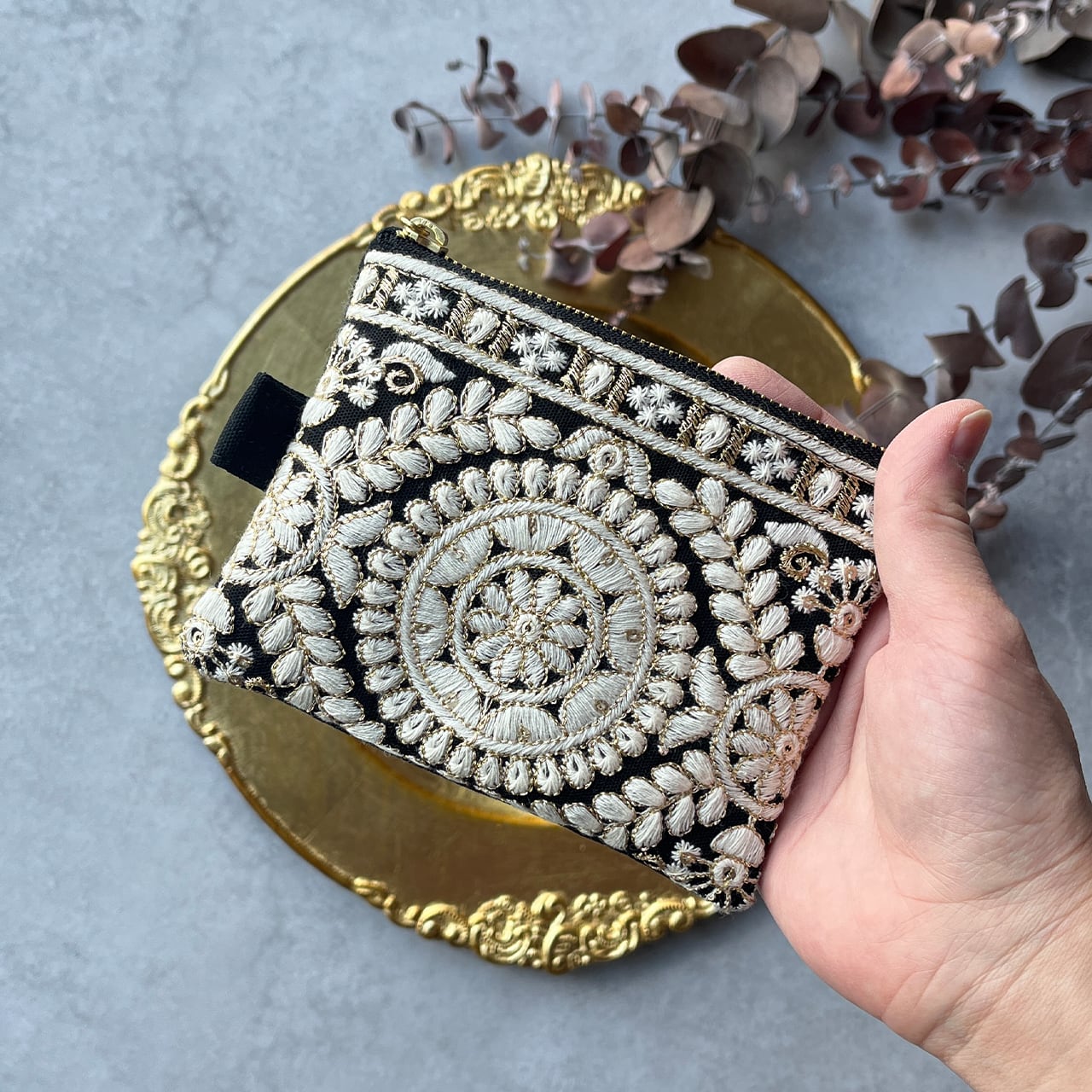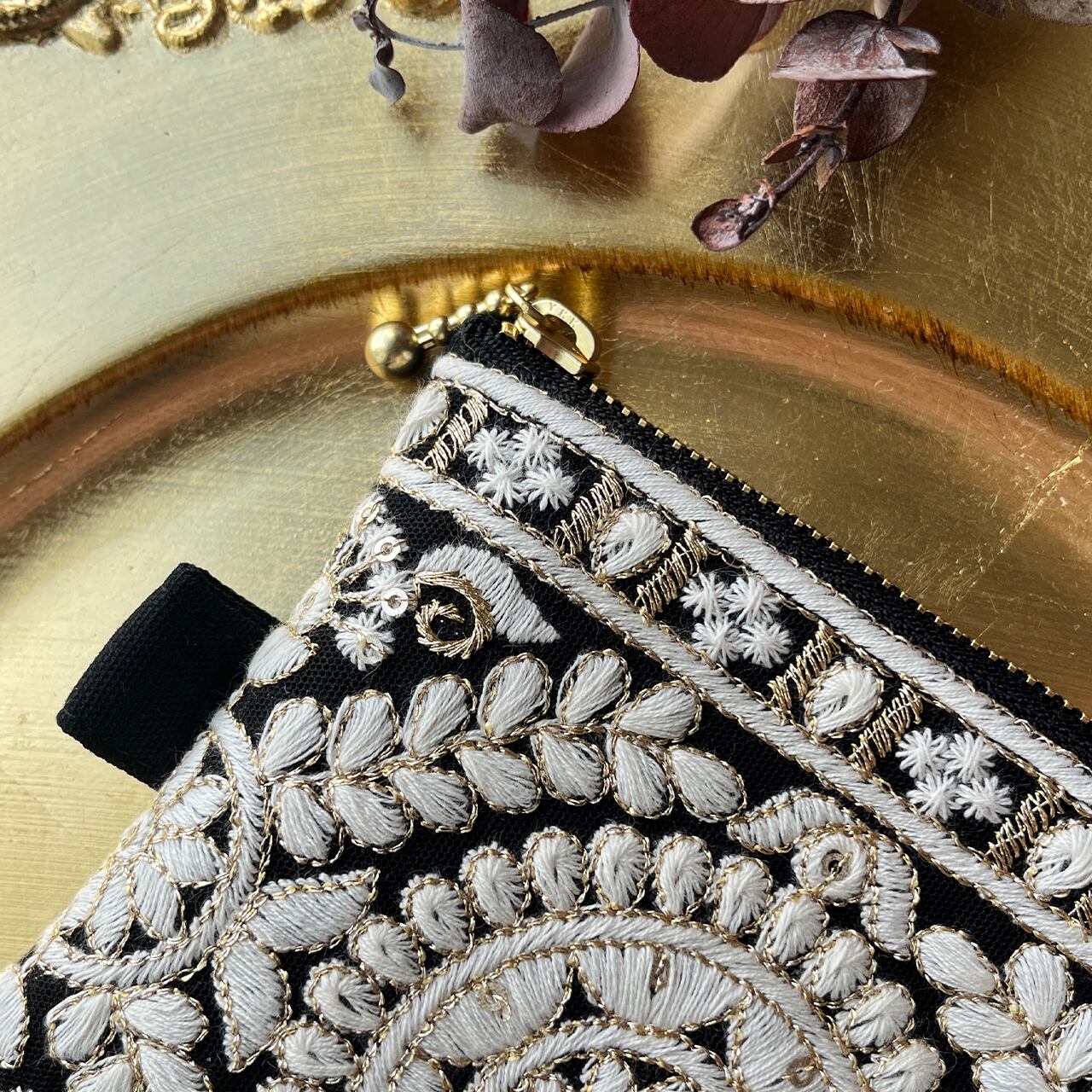インパクトのあるインド刺繍リボンを片面にあしらったフラットポーチです。