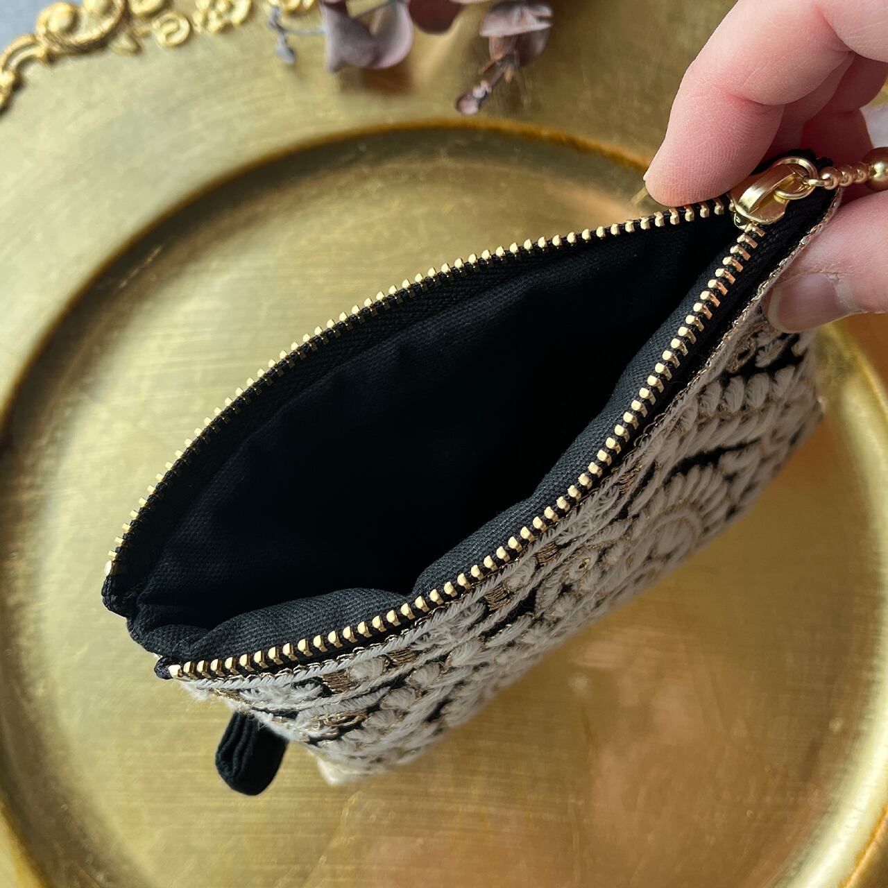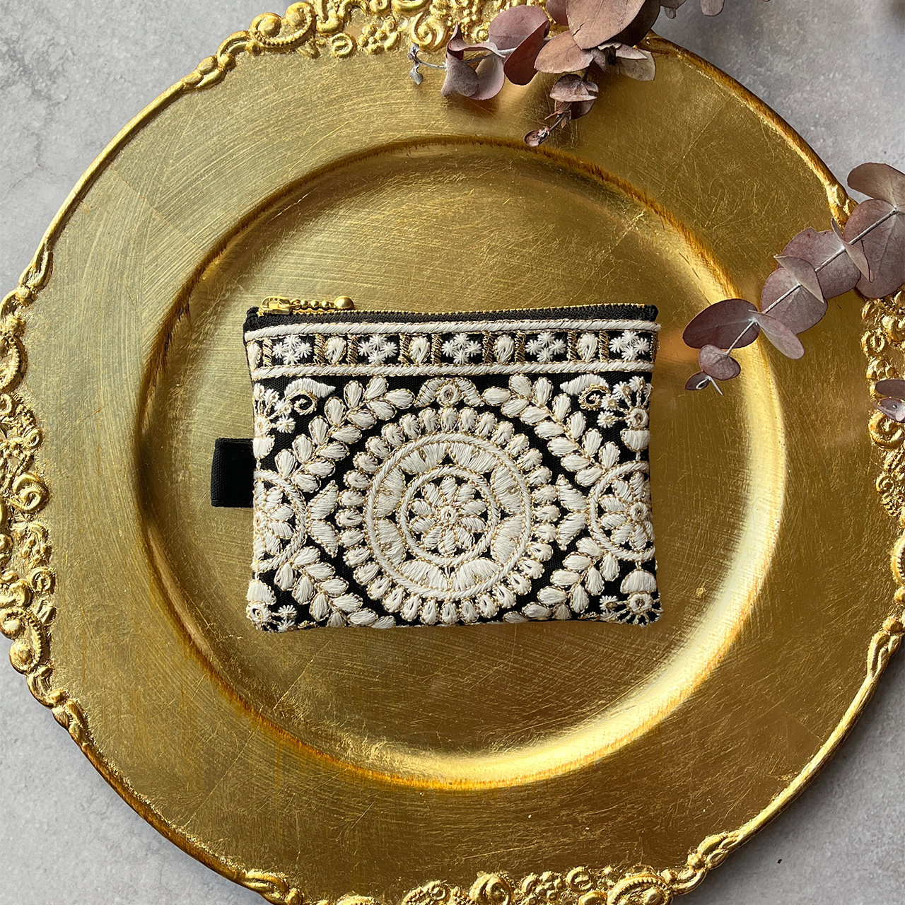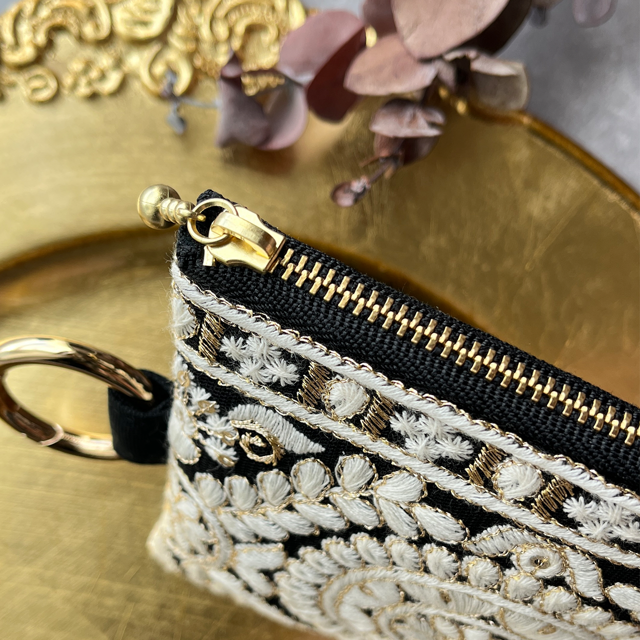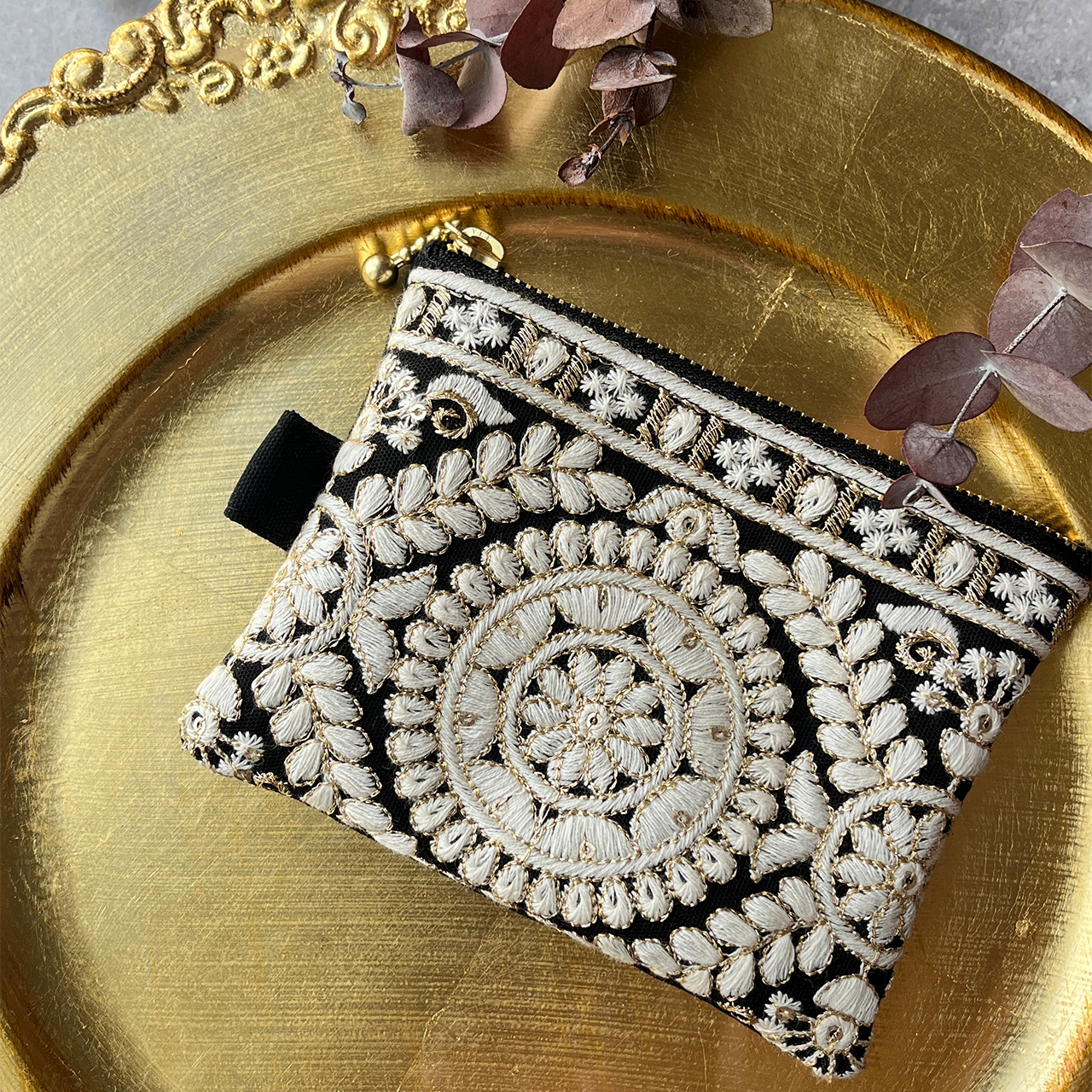 インパクトのあるインド刺繍リボンを片面にあしらったフラットポーチです。