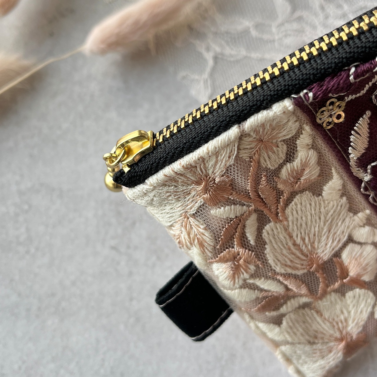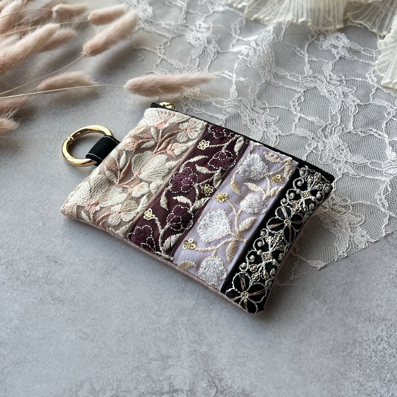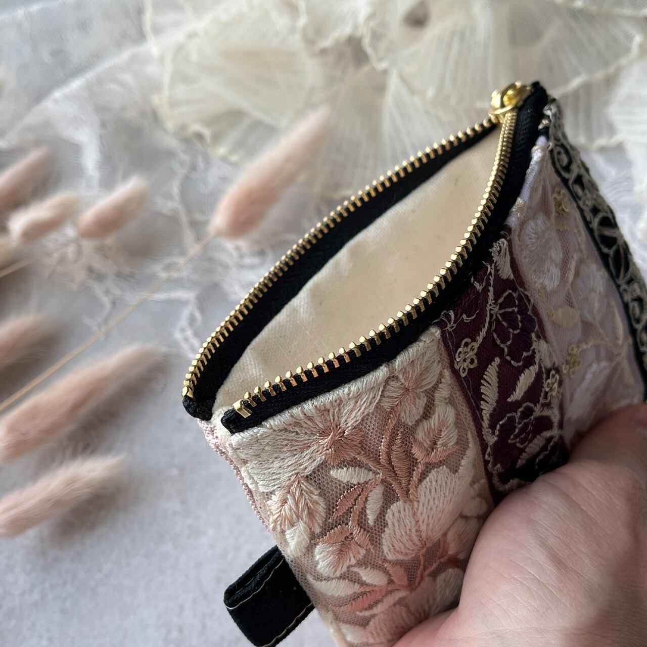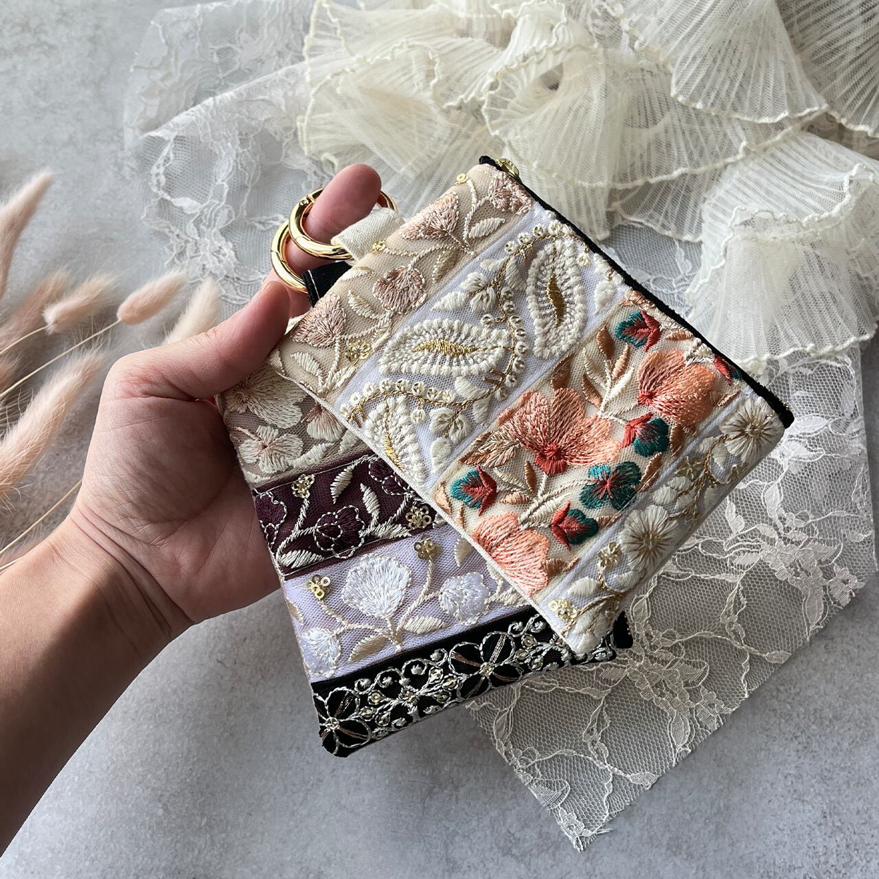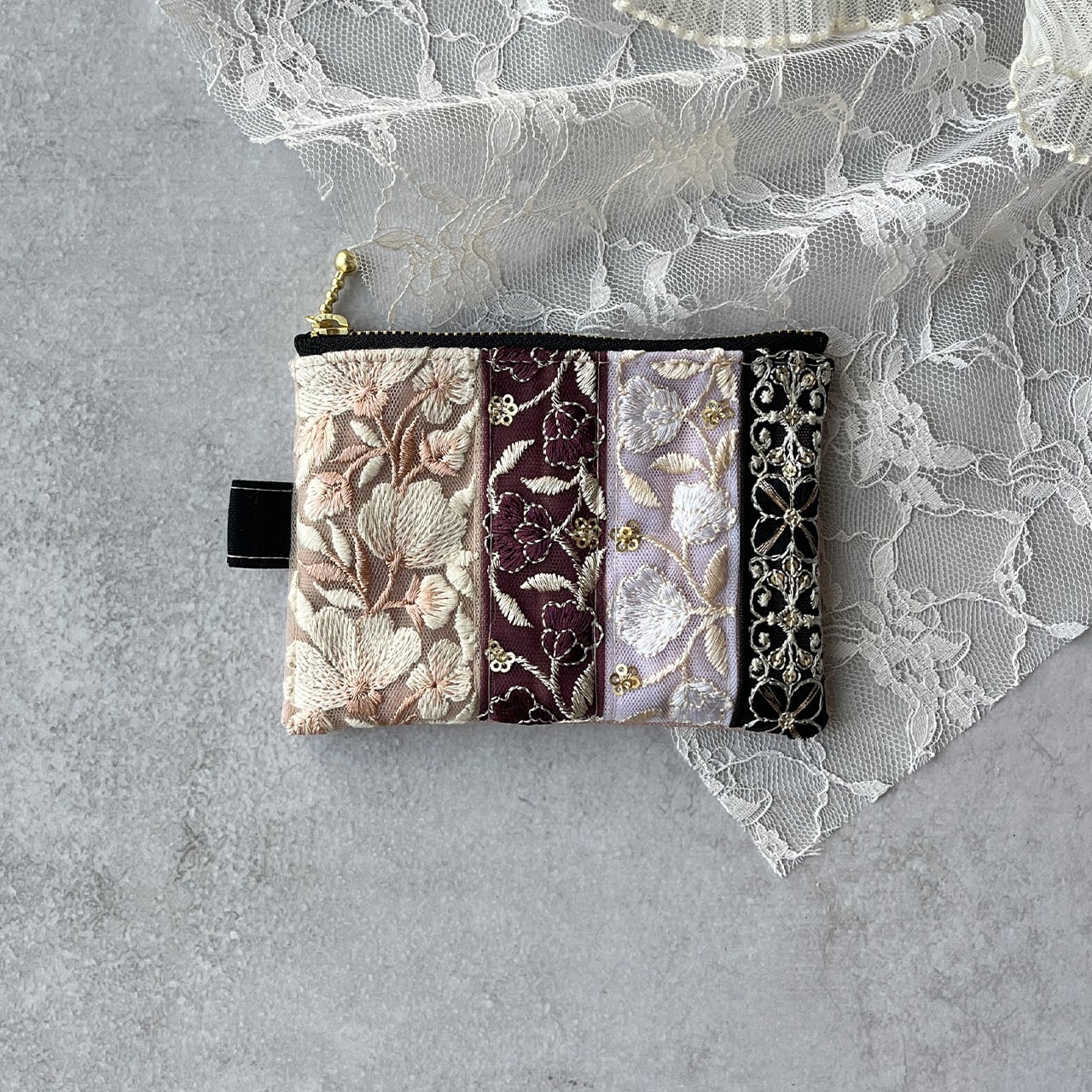 パッチワーク風のインド刺繍リボンを片面にたっぷりあしらったフラットポーチです。
