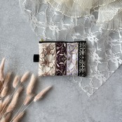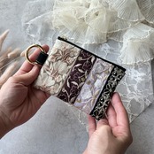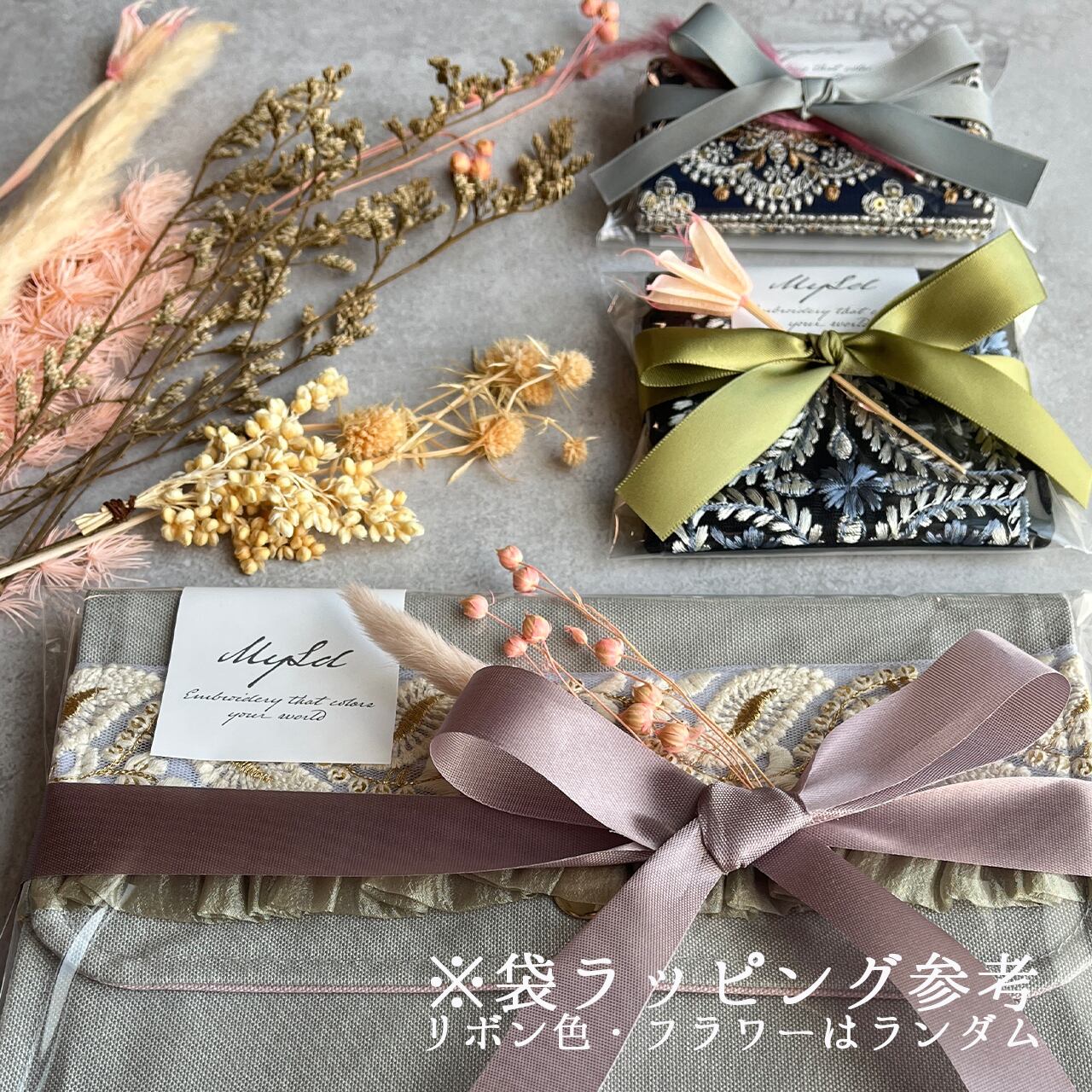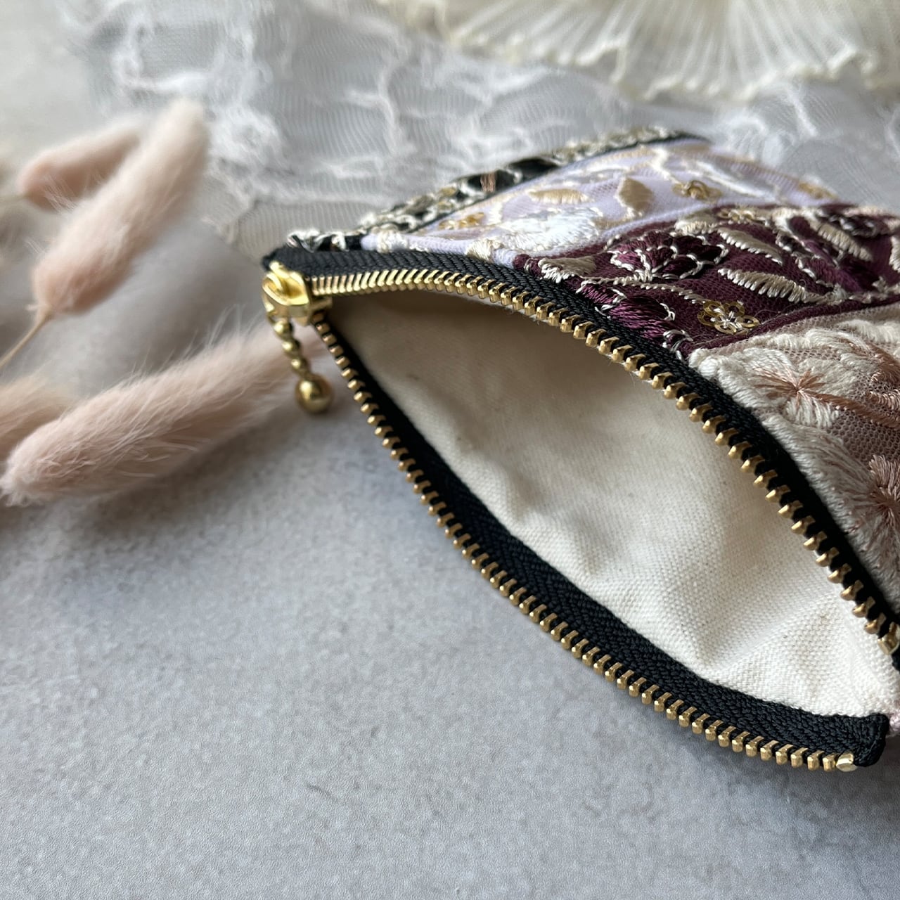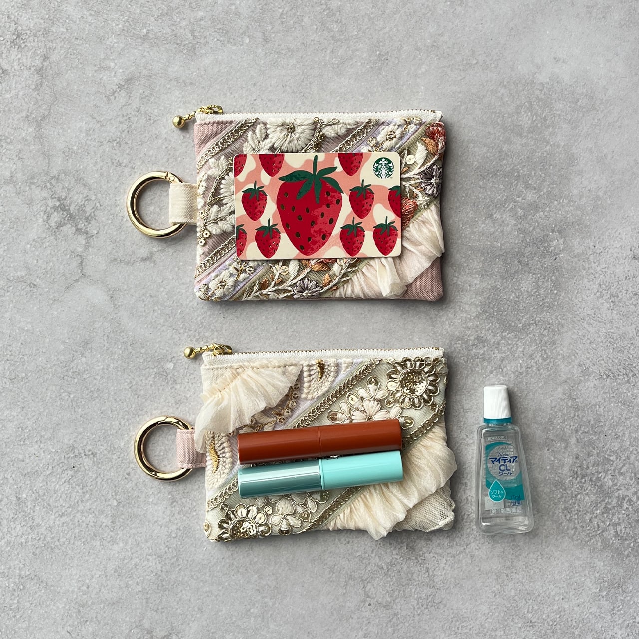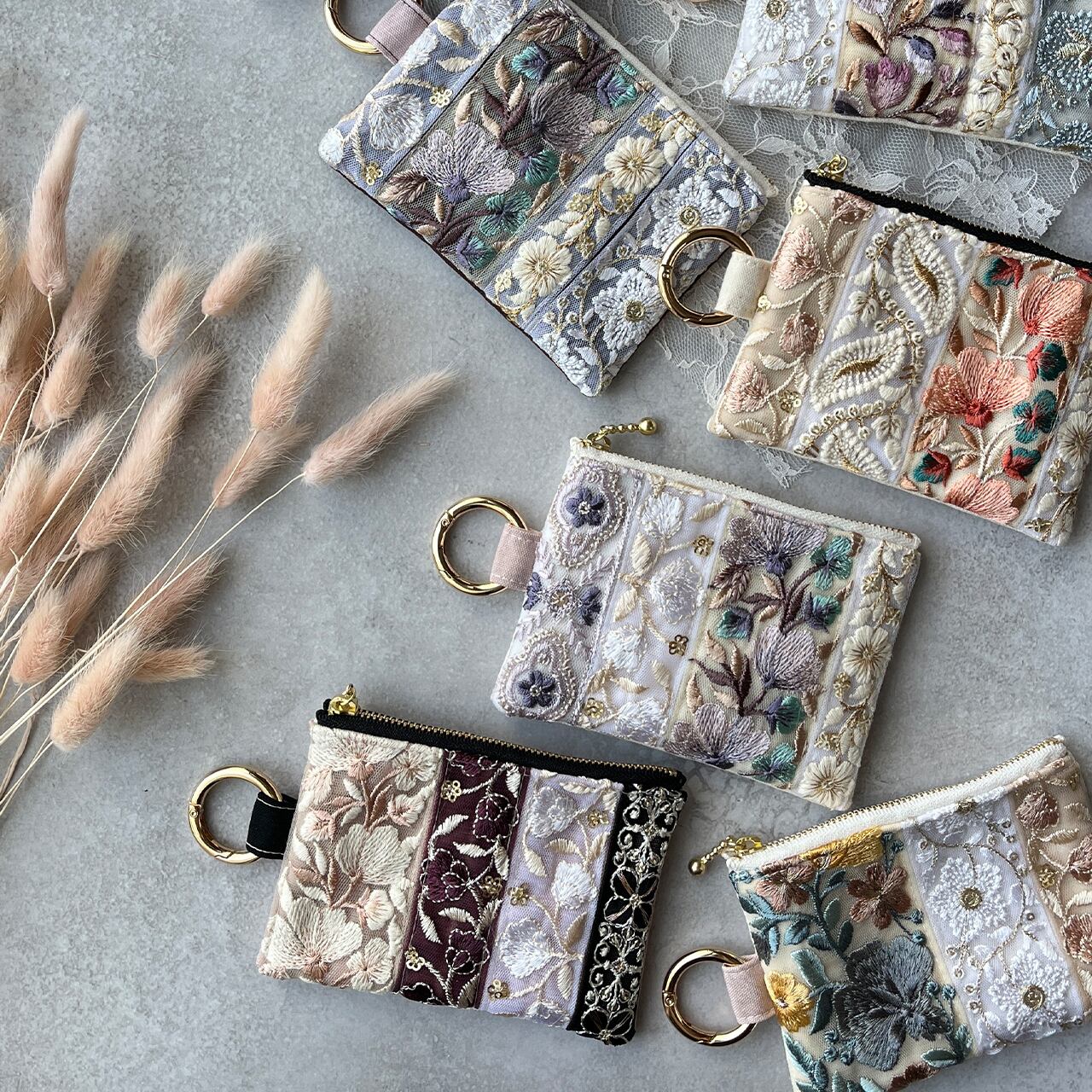 パッチワーク風のインド刺繍リボンを片面にたっぷりあしらったフラットポーチです。