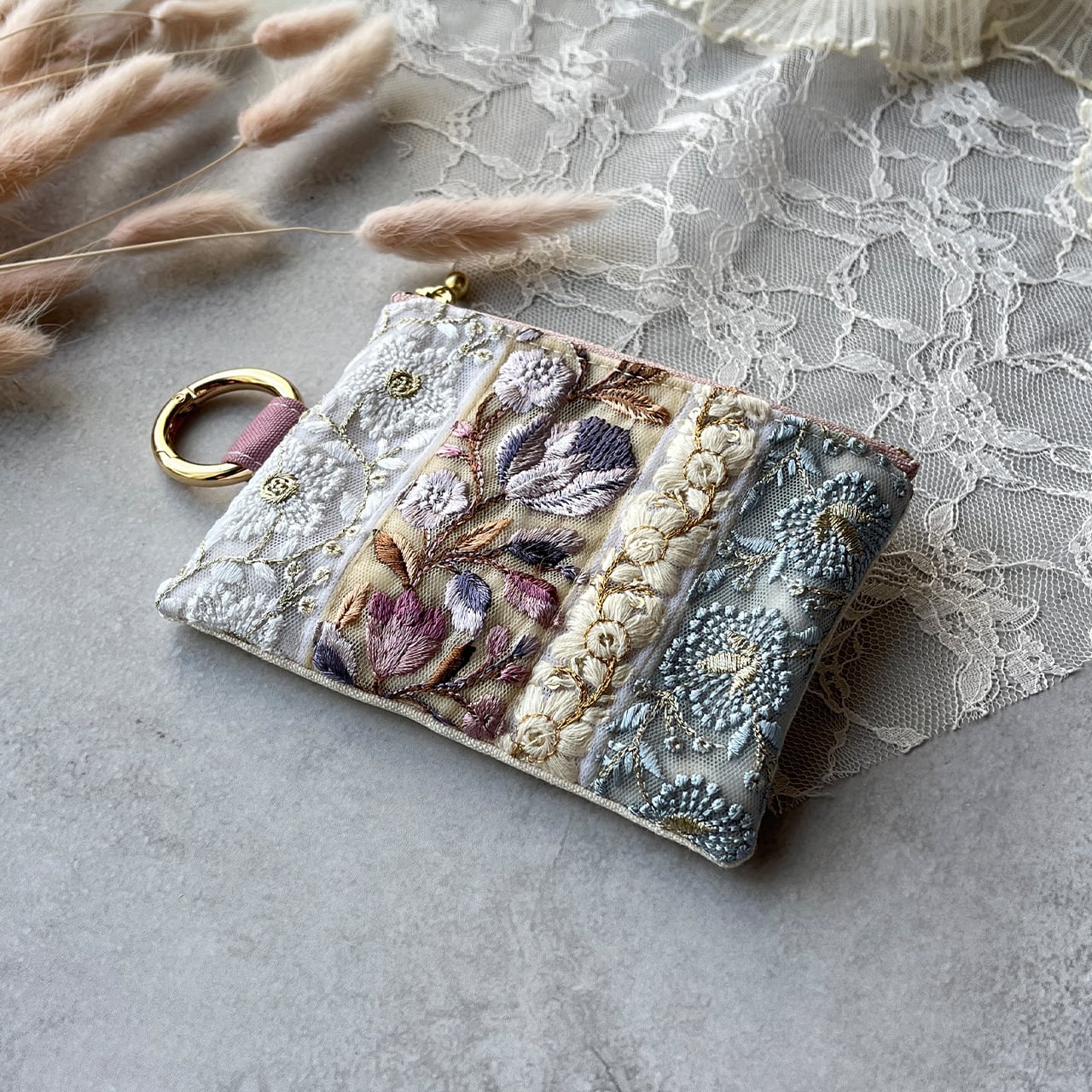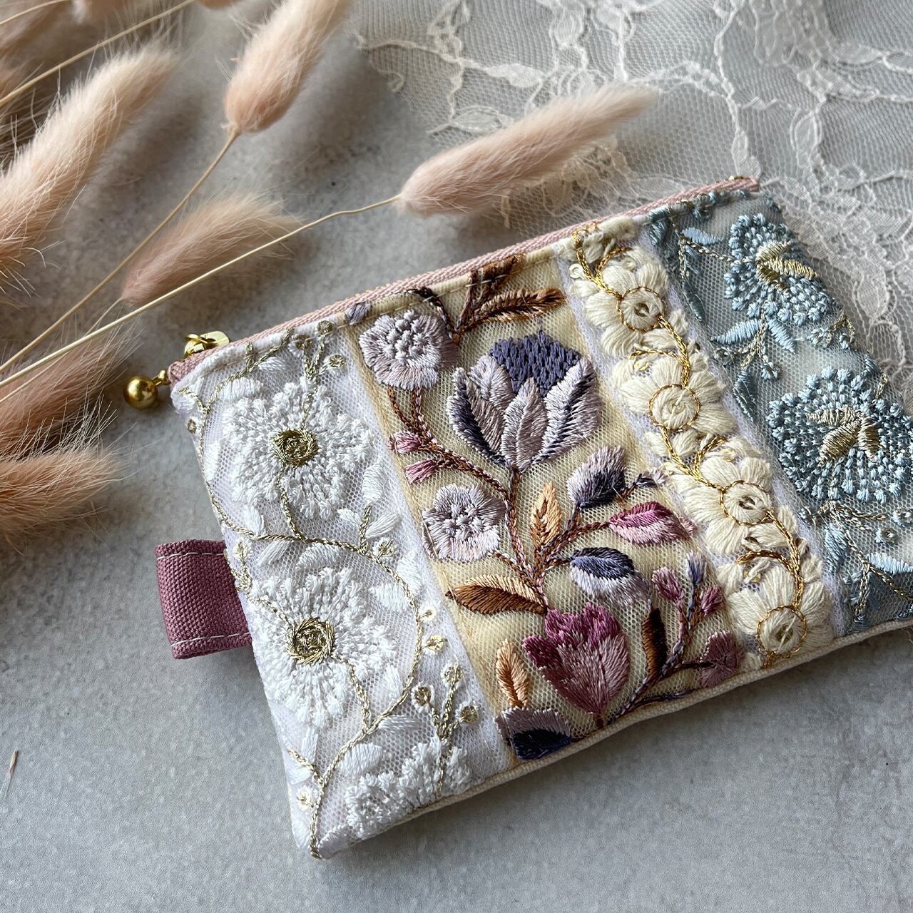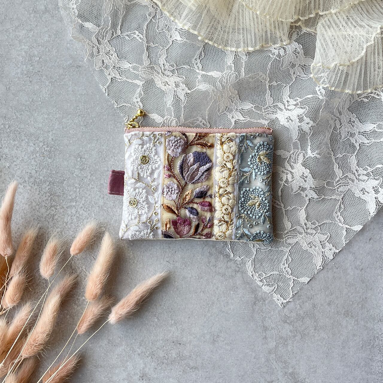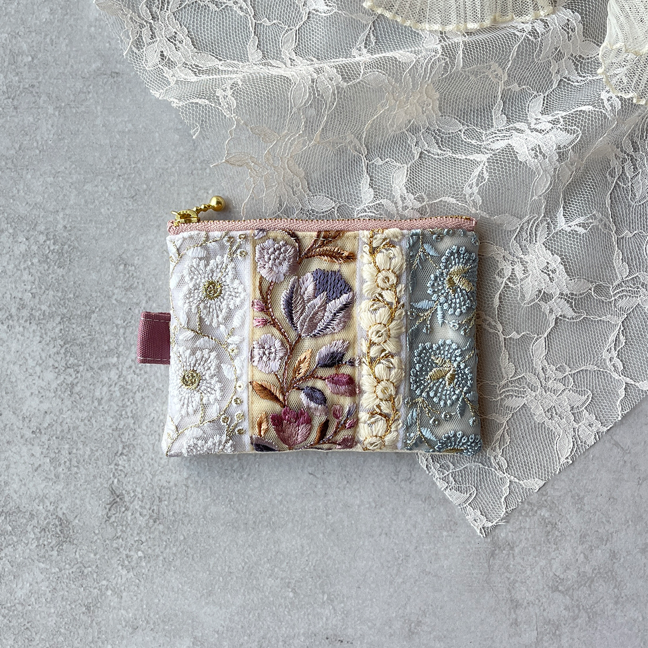 パッチワーク風のインド刺繍リボンを片面にたっぷりあしらったフラットポーチです。