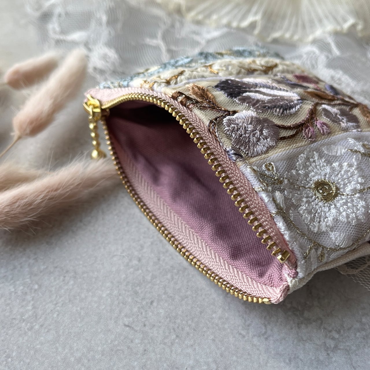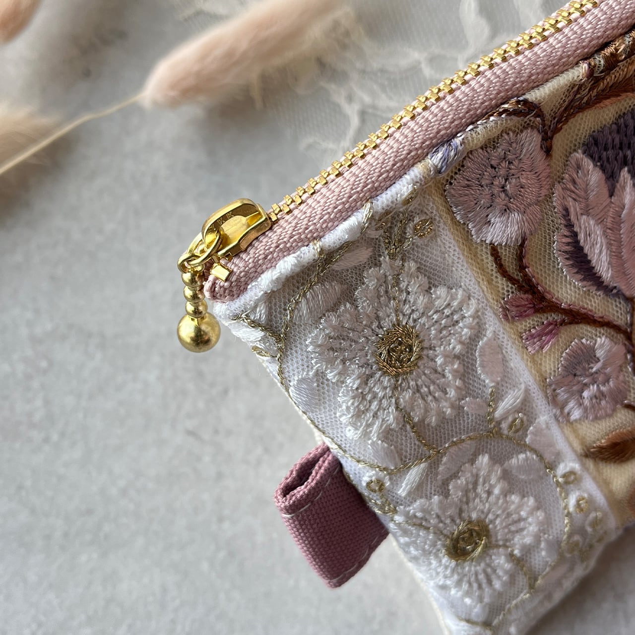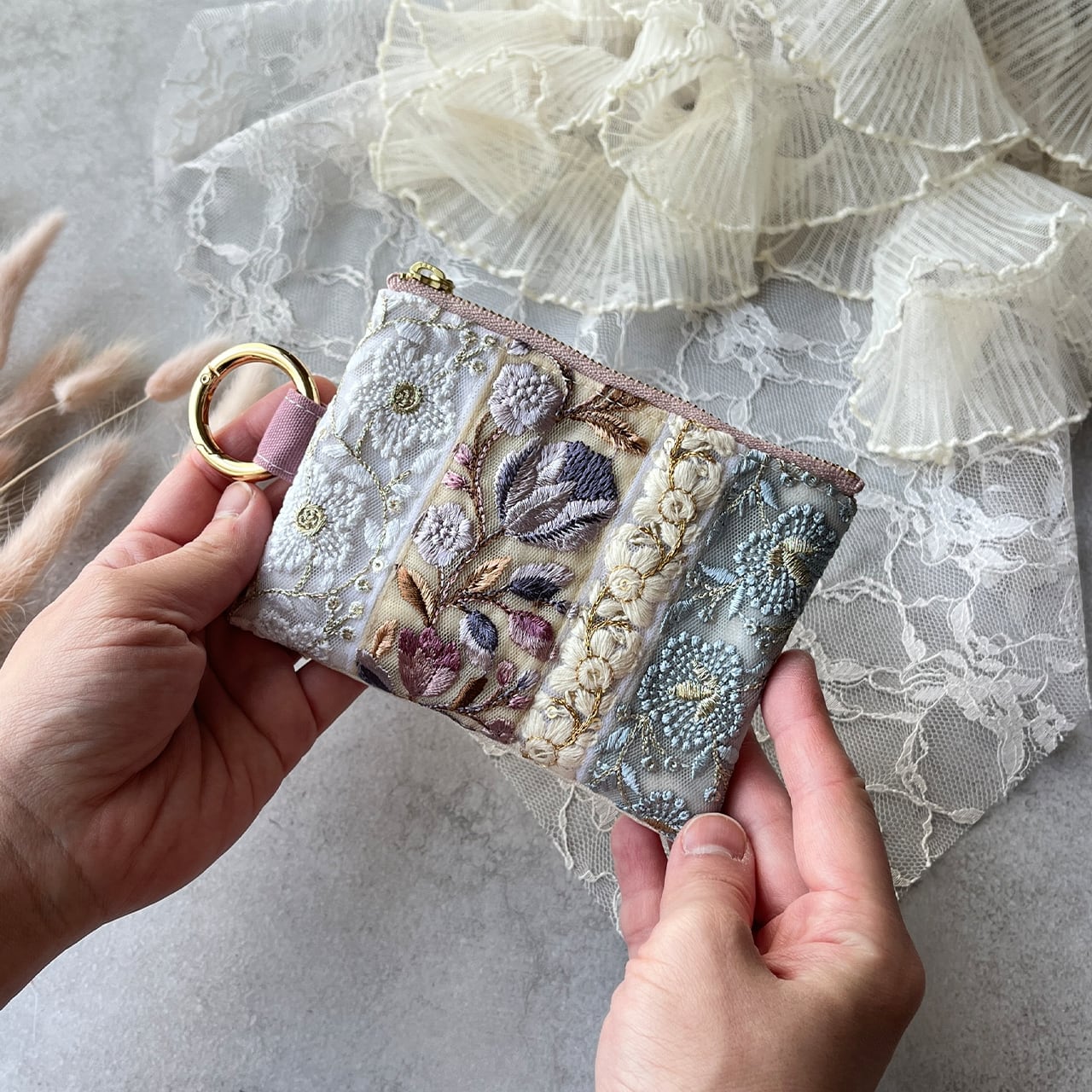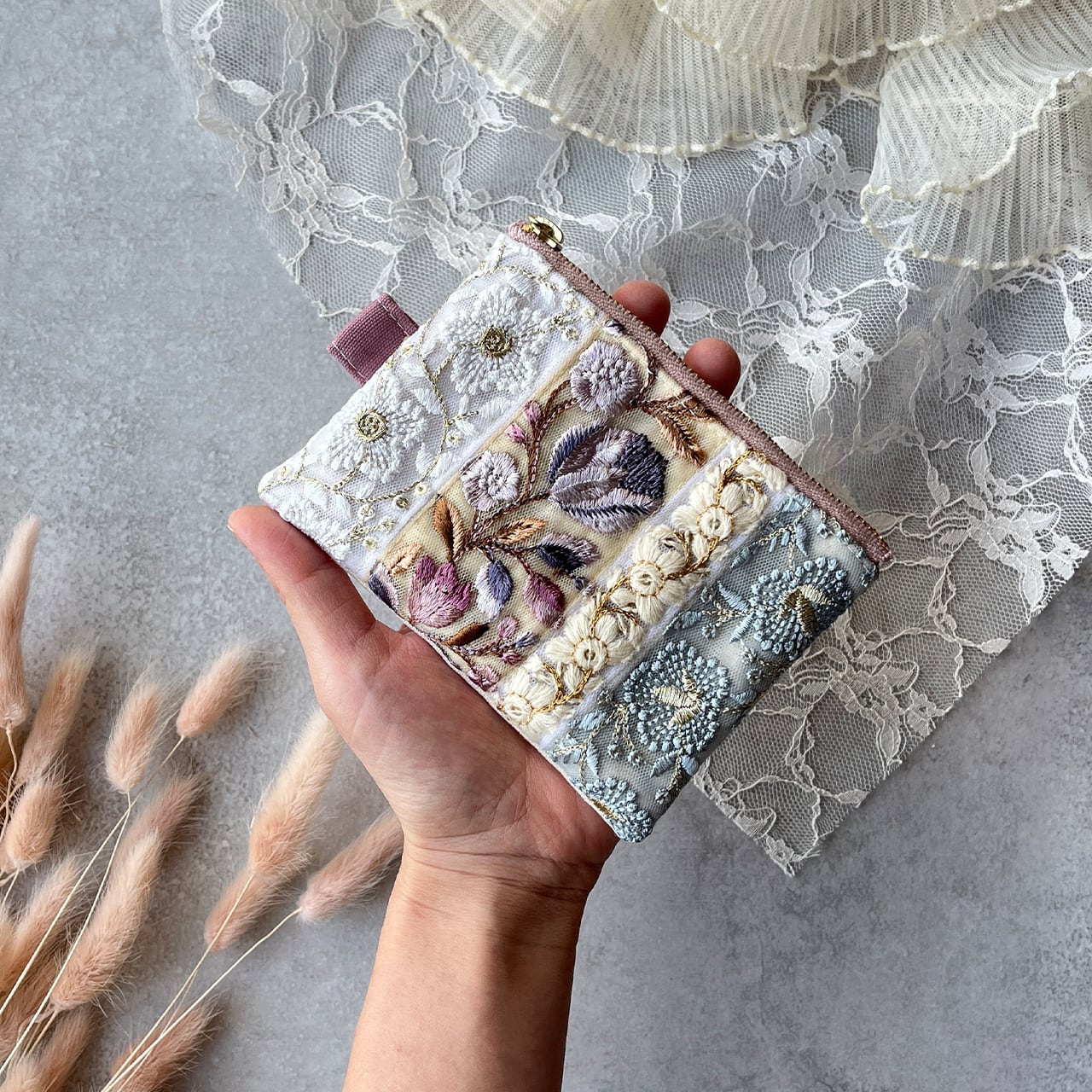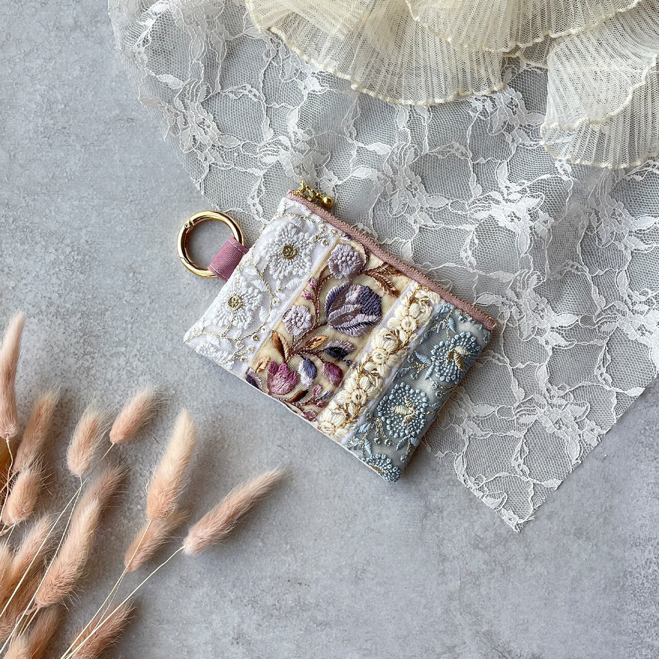 パッチワーク風のインド刺繍リボンを片面にたっぷりあしらったフラットポーチです。