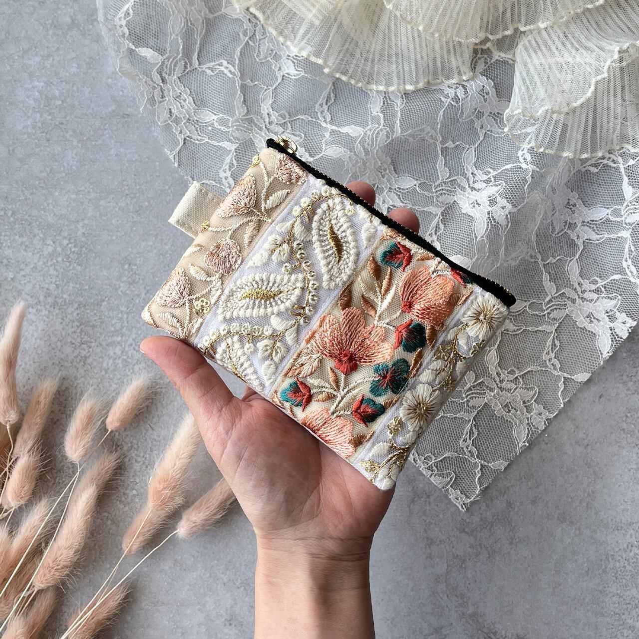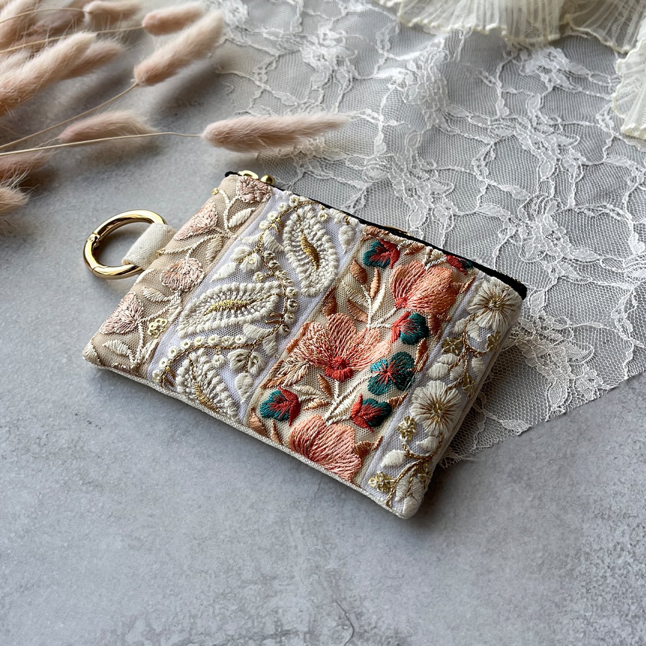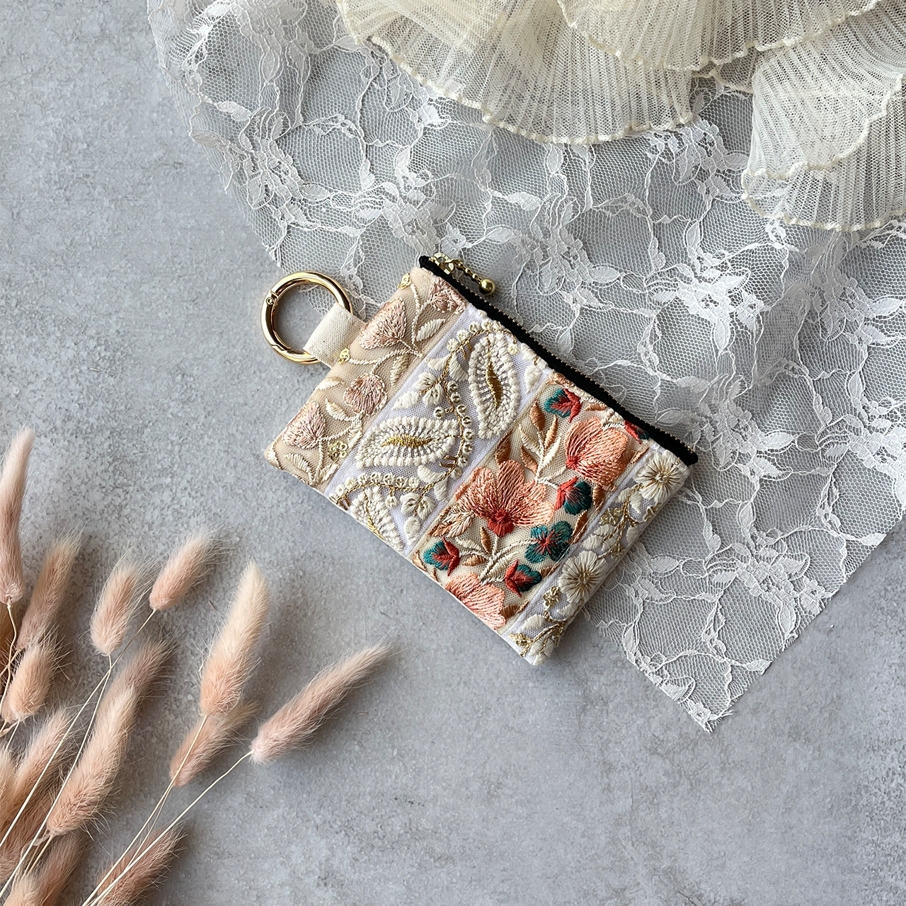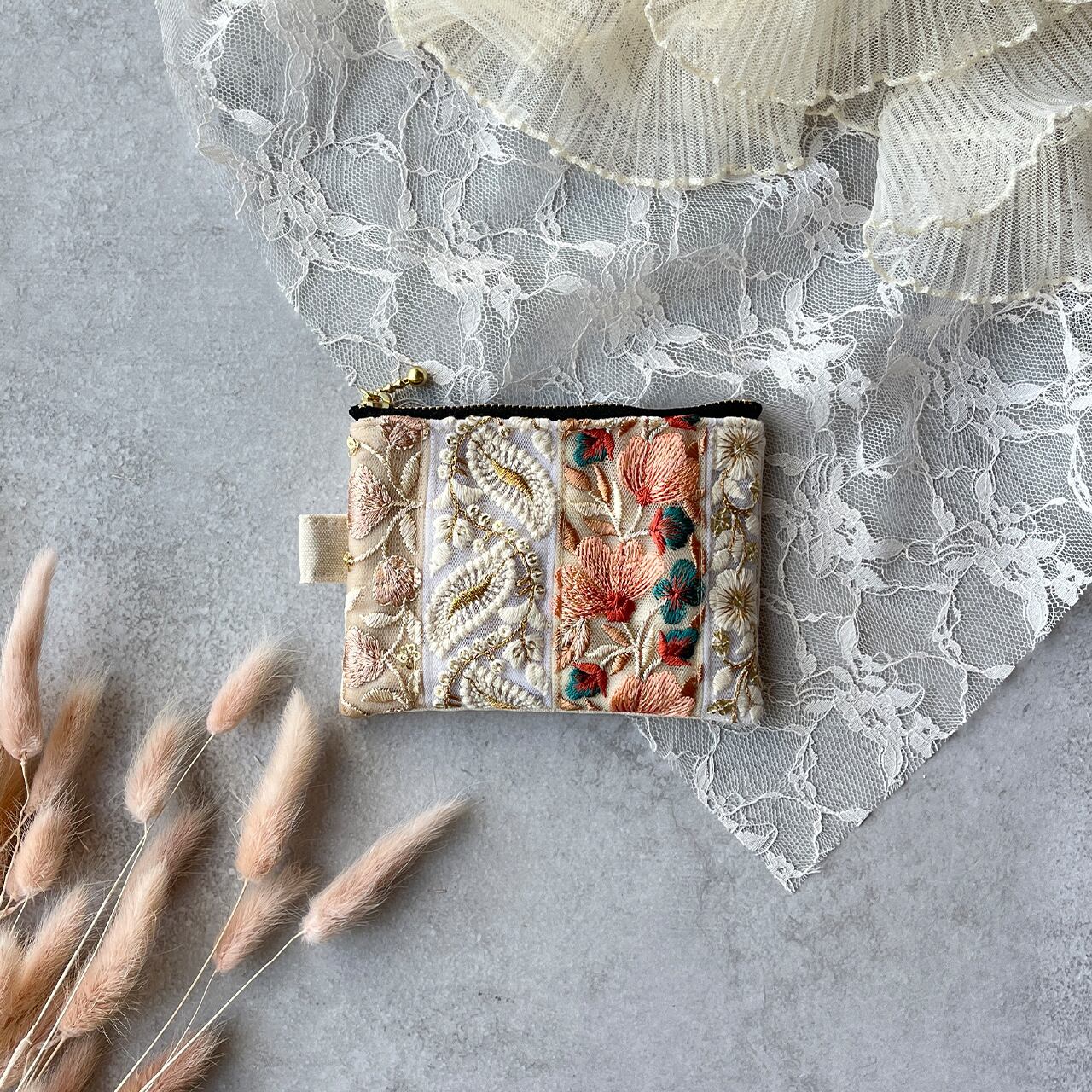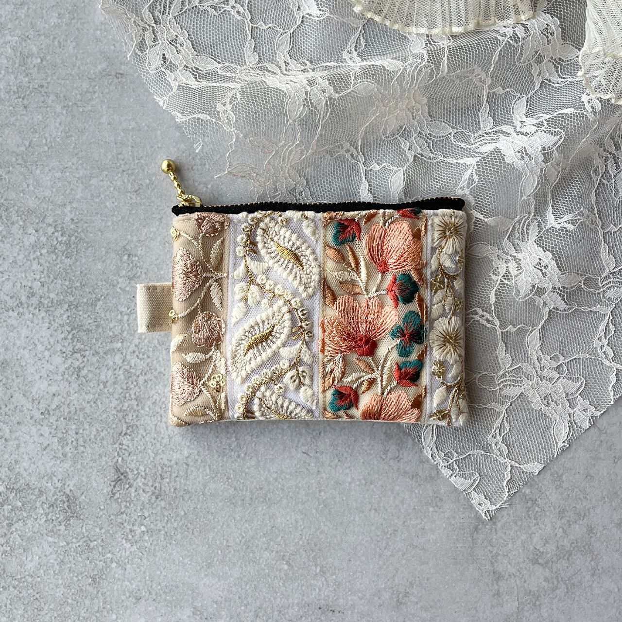 パッチワーク風のインド刺繍リボンを片面にたっぷりあしらったフラットポーチです。