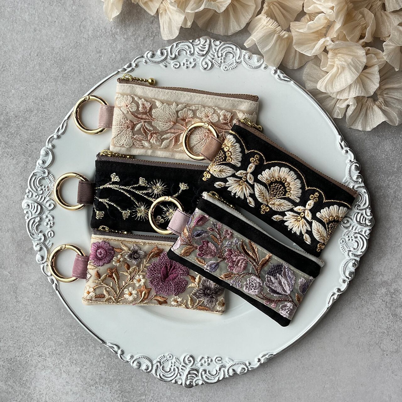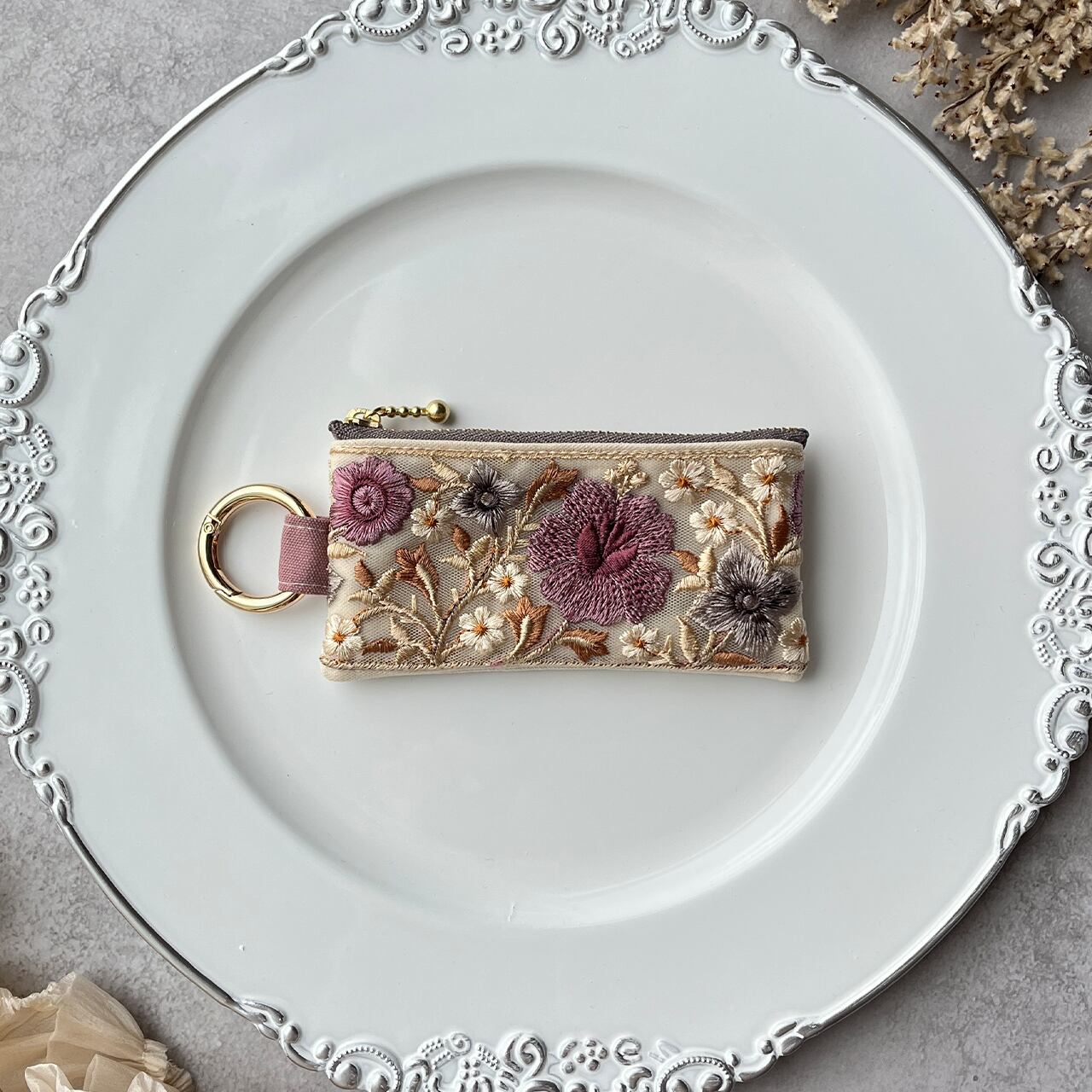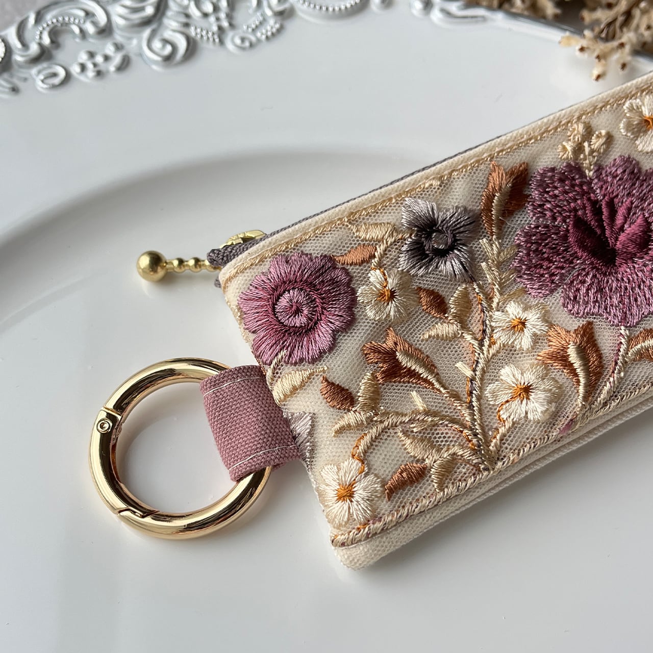 インド刺繍リボンを片面にあしらったミニファスナーポーチです。