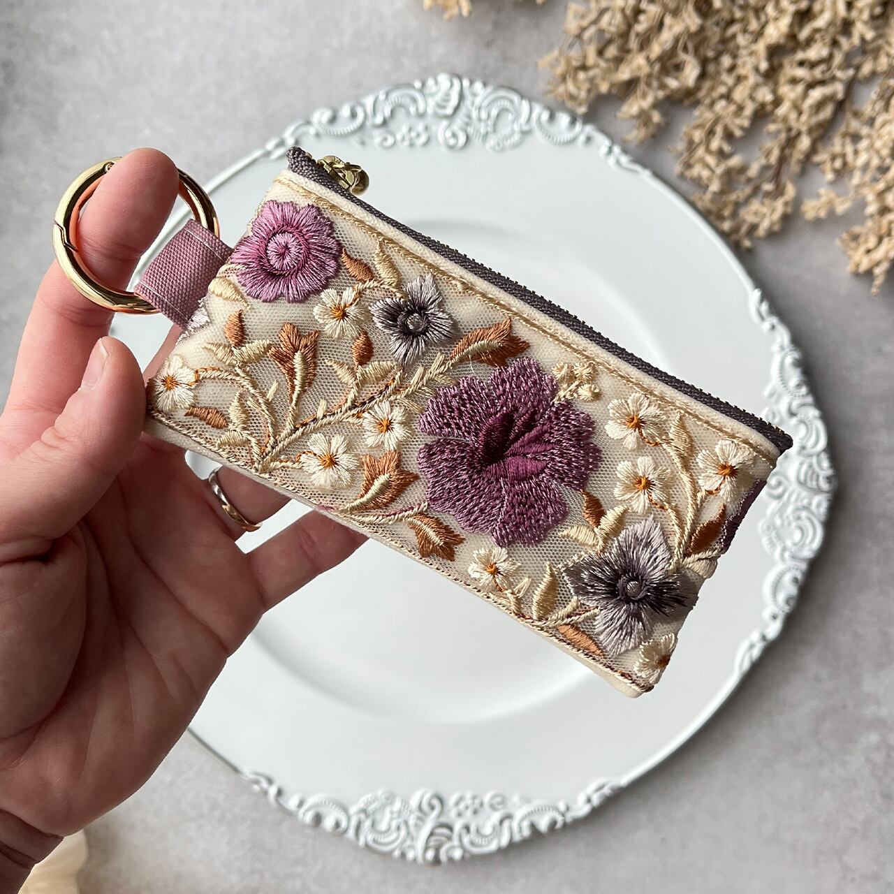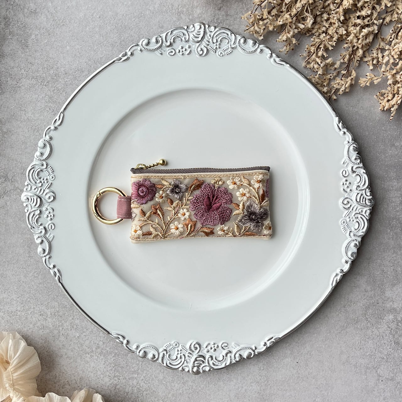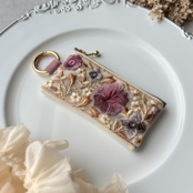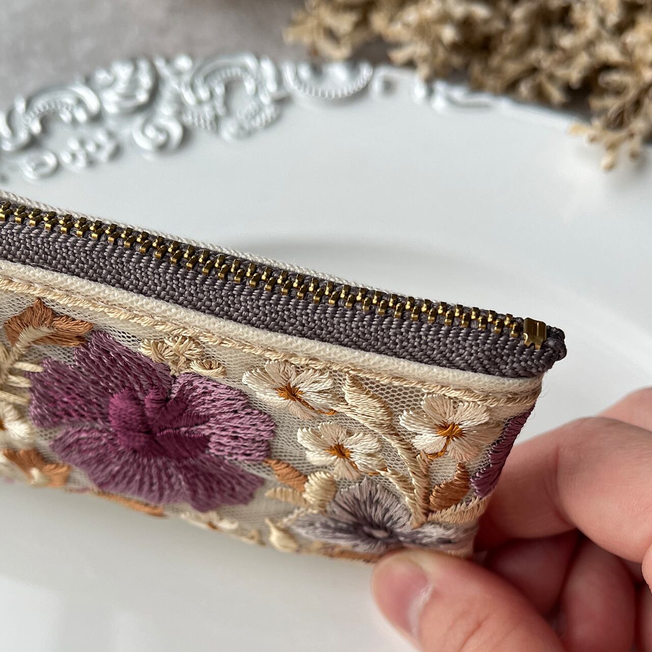 インド刺繍リボンを片面にあしらったミニファスナーポーチです。